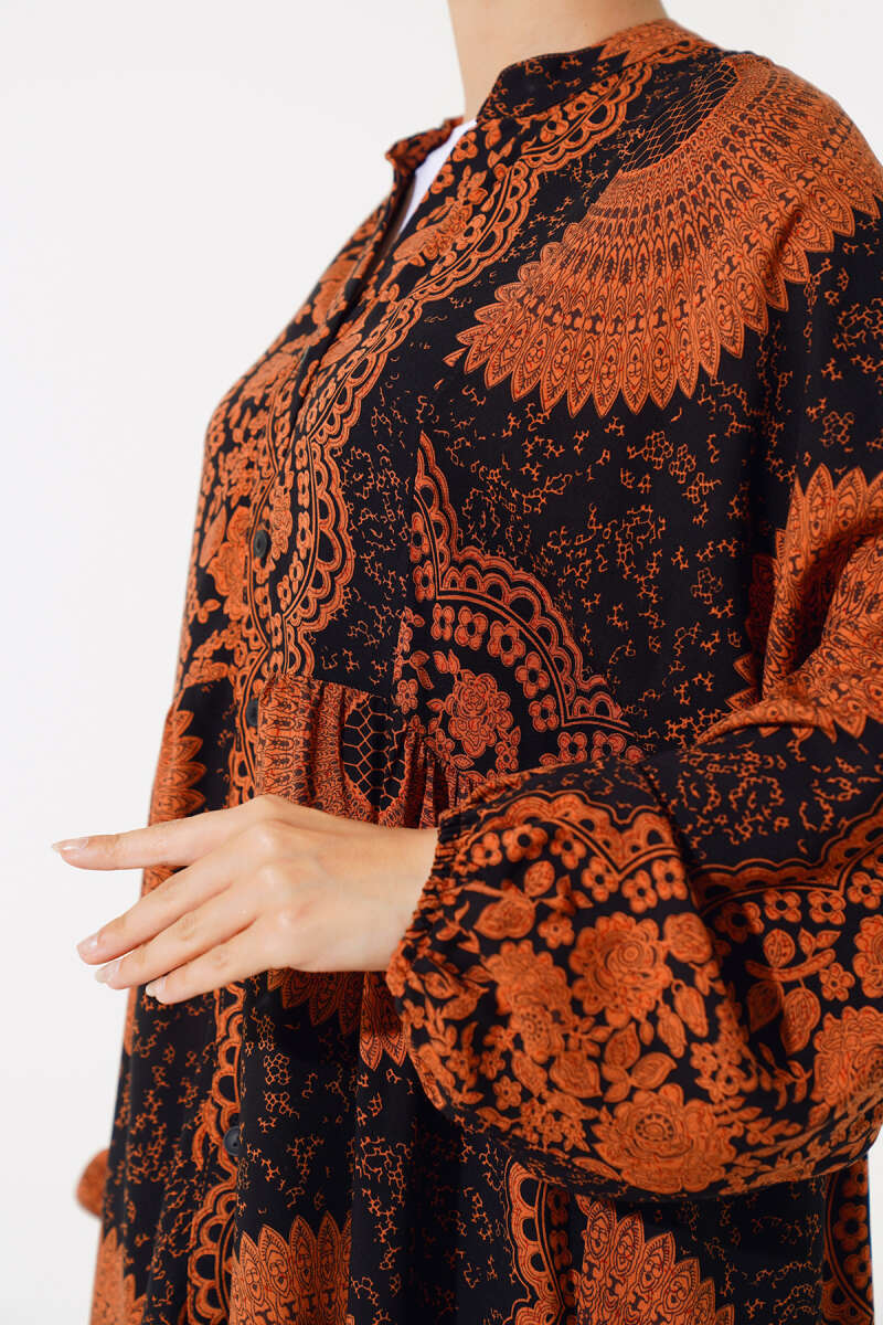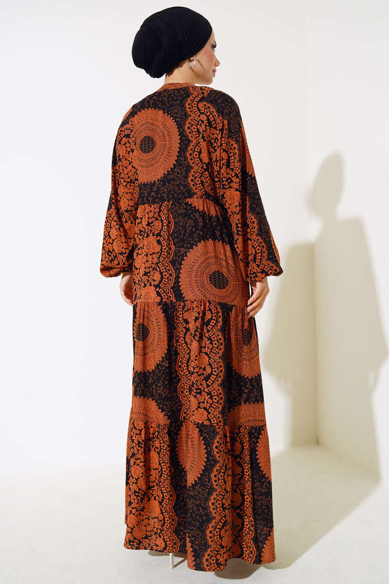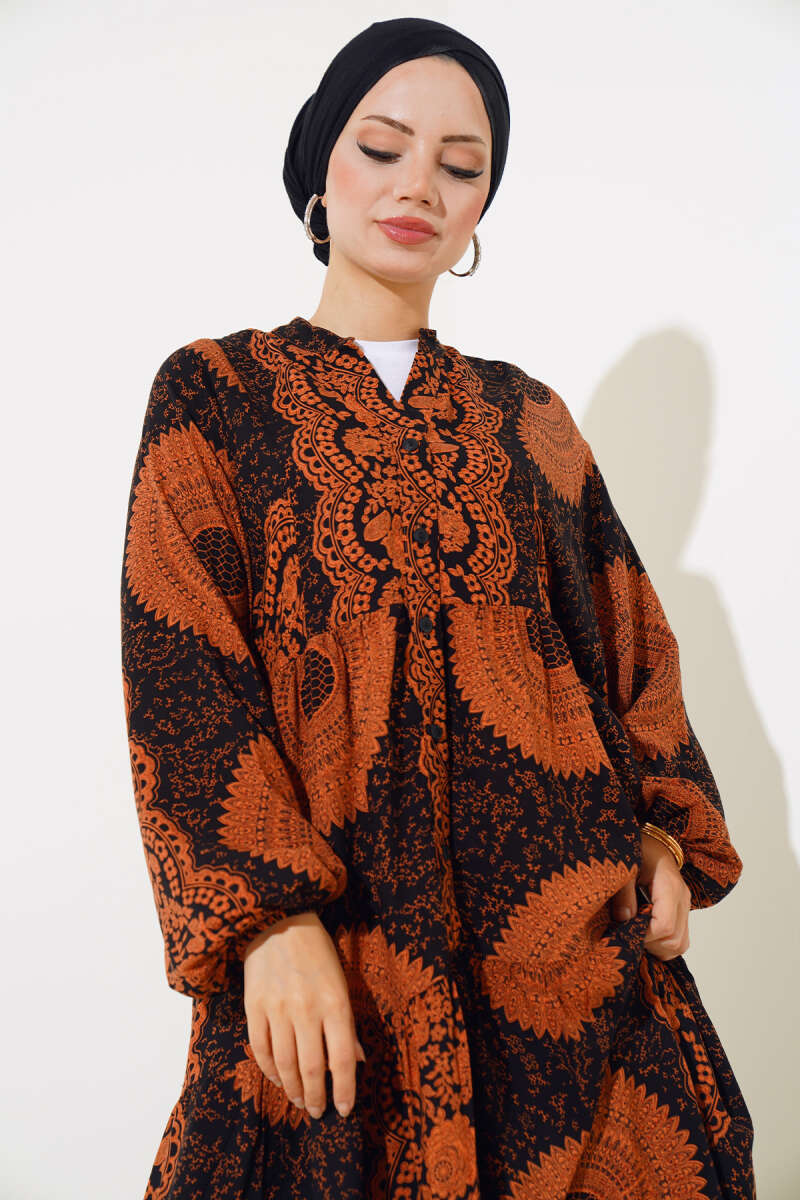 Önden Düğmeli Desenli Elbise Taba
