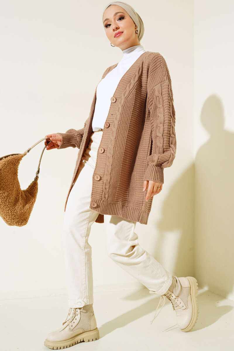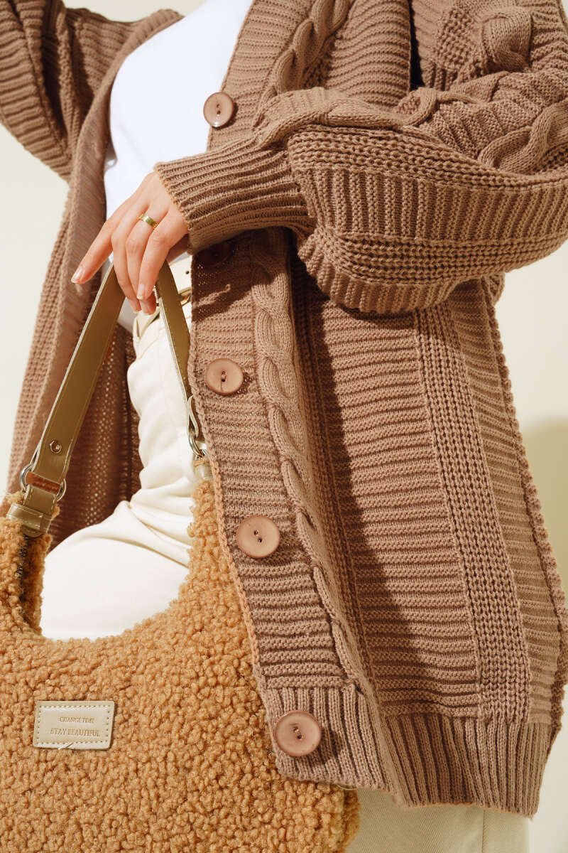 Atkılı Düğmeli Cepli Triko Hırka Vizon