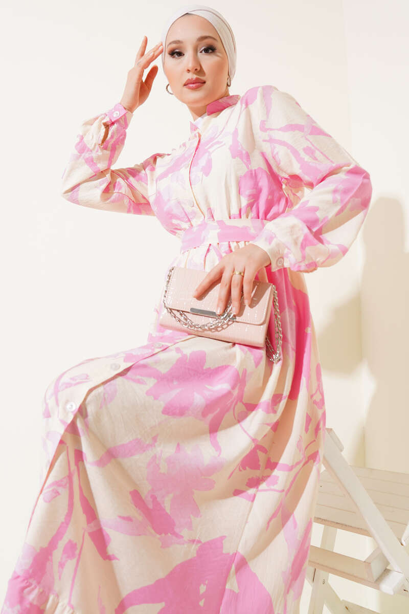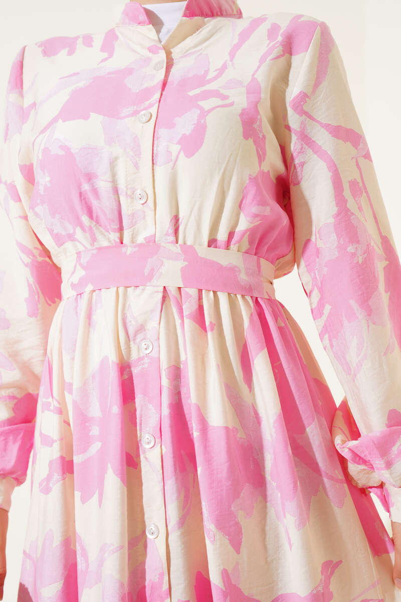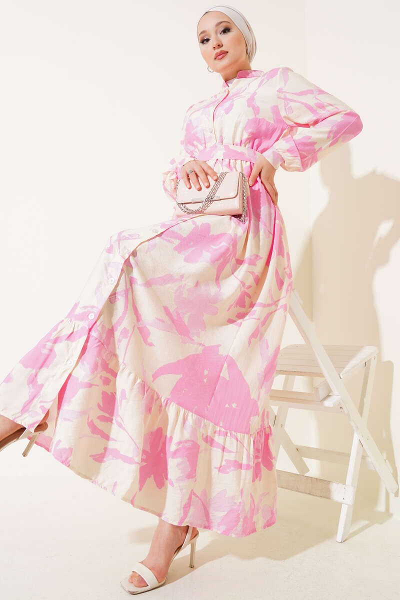 Önden Düğmeli Yaprak Desenli Elbise Pembe