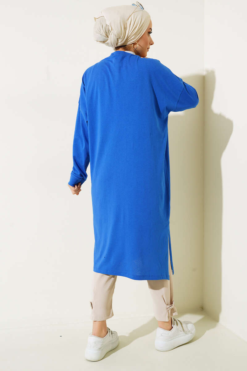 Yeni sezonun favorisi tuniğimiz uzun yapıdadır. Düşük omuzlu olan tuniğimiz baskılı yazısıyla dikkat çekmektedir. Tuniğimiz oval yakadır. Yanları yırtmaçlıdır. Renk seçenekleri mevcuttur.