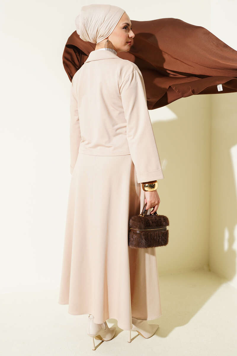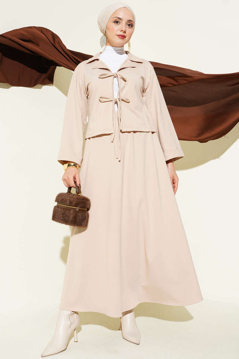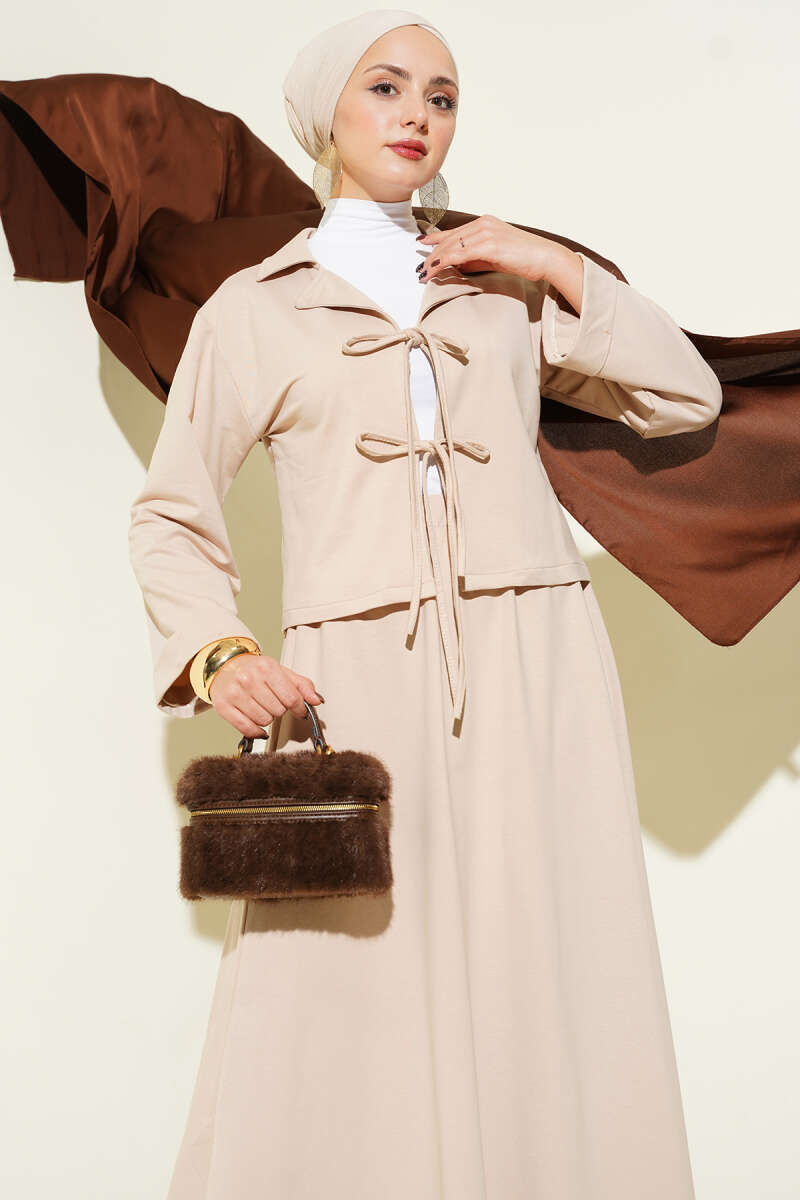 Önü Bağcık Detaylı Etekli İkili Takım Kahve