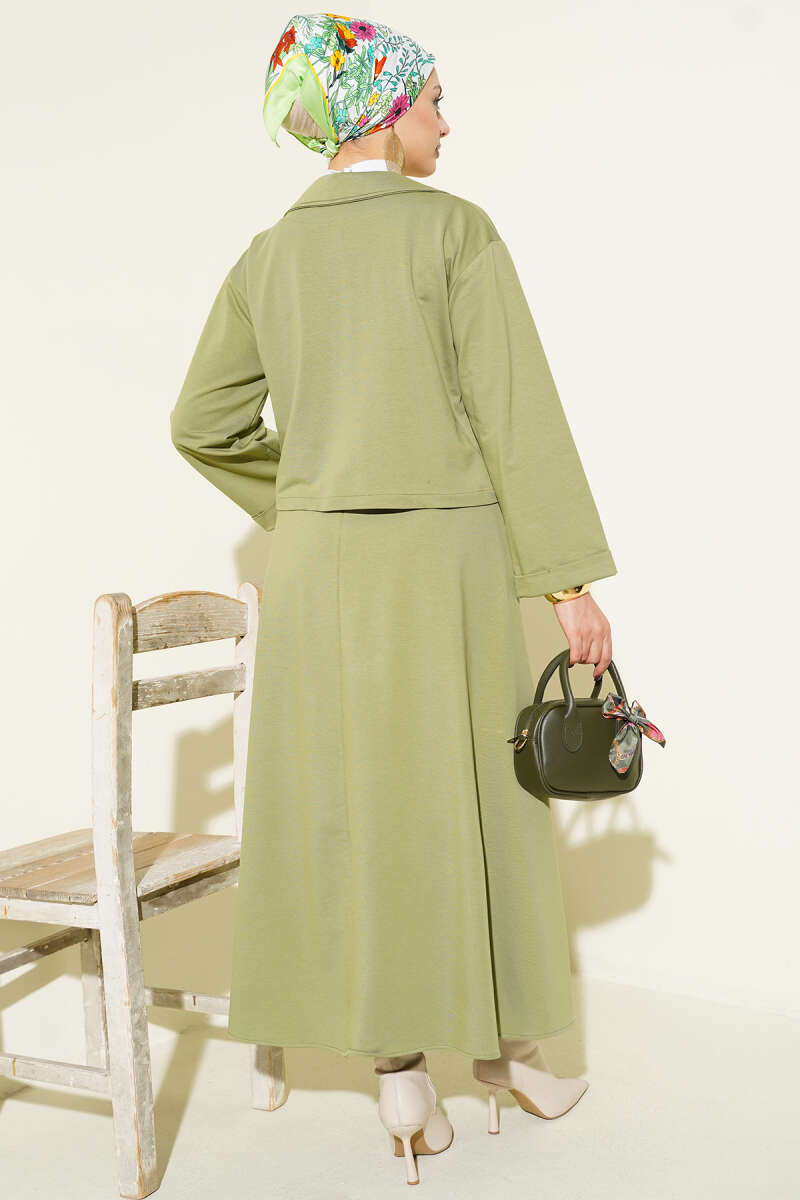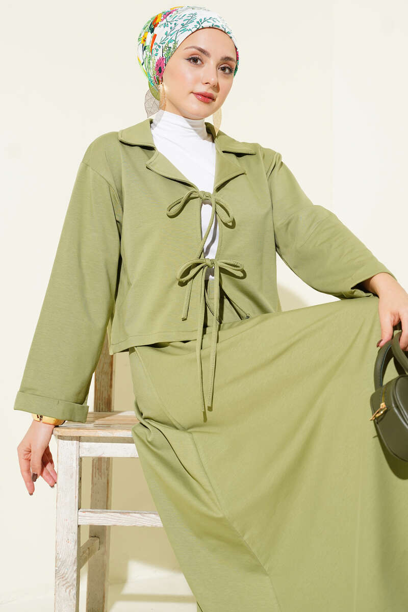 Kabartma Şeritli Taşlı Triko İkili Takım Yağ Yeşili