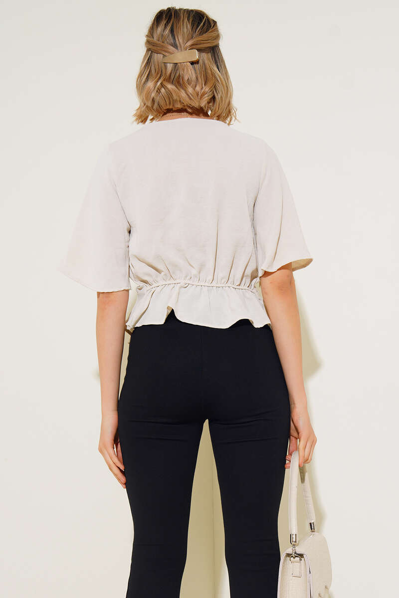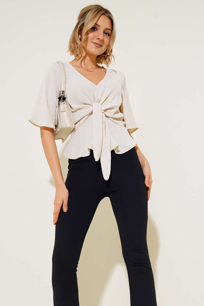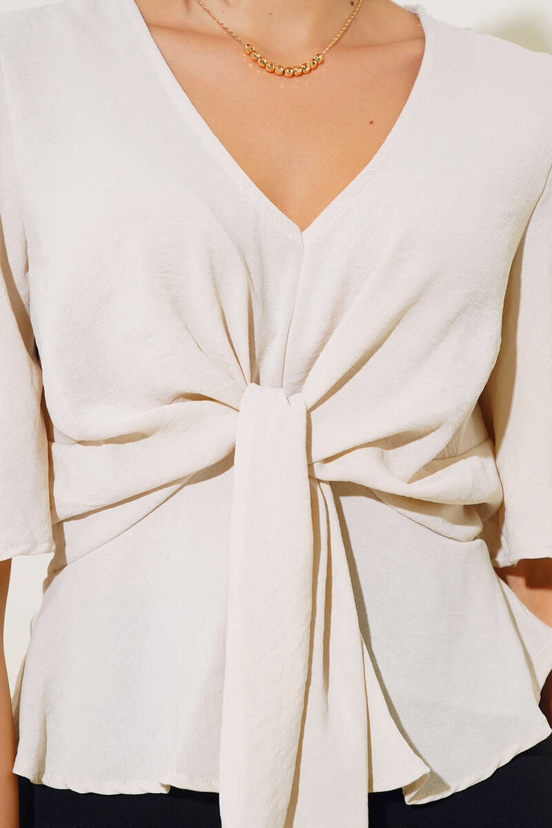Yeni sezon bluz modelimiz favorilerinizin arasında yer alacak. Önü büzgülü bluz modelimiz aynı zamanda bağlamalıdır. Yarım geniş kol modeldir. Şık duruşuyla kombinlerinizin yıldız parçası olacak bluzumuz dolaplarınızda yerlerini beklemektedir.
