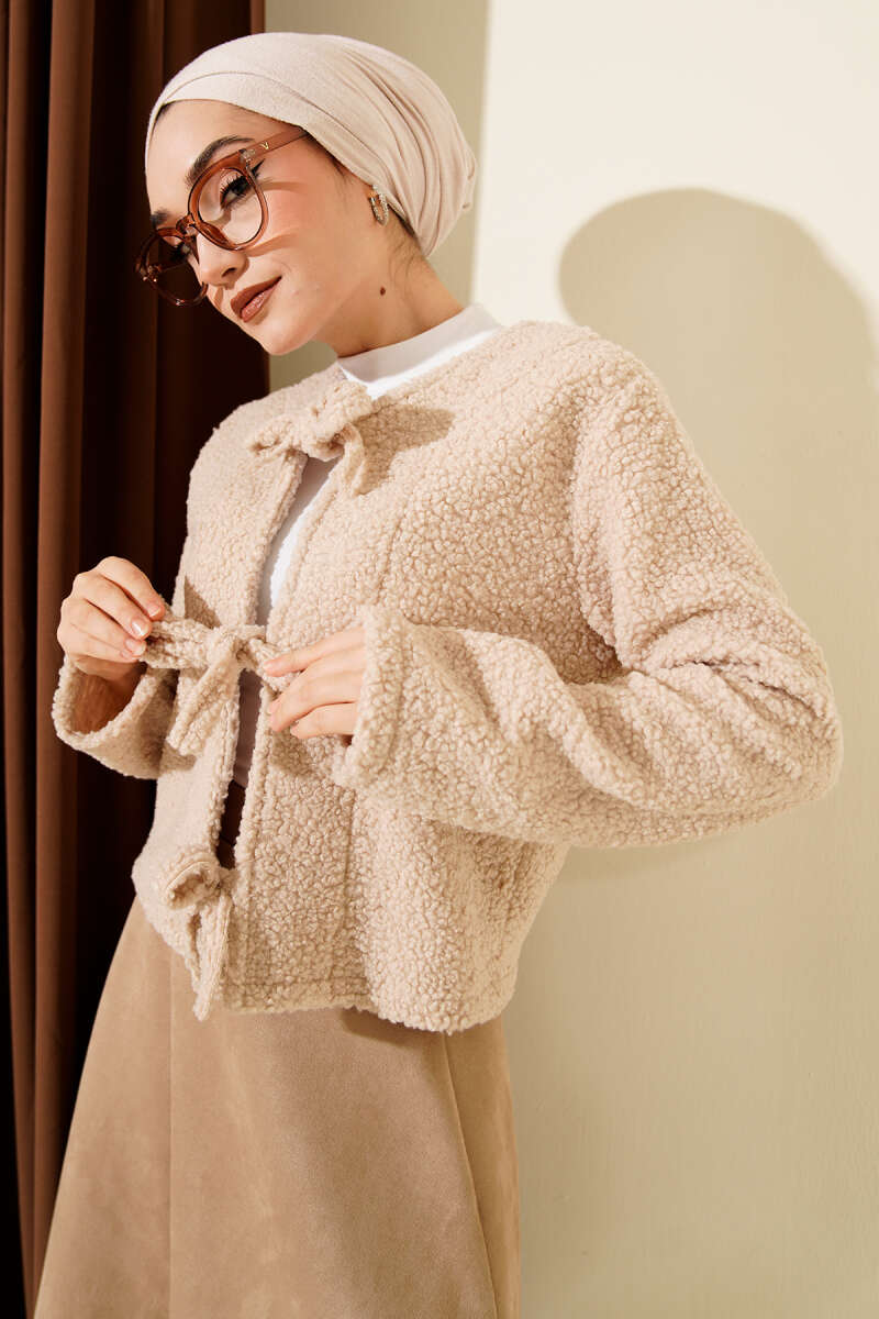 Önü Bağlamalı Buklet Kısa Kimono Latte