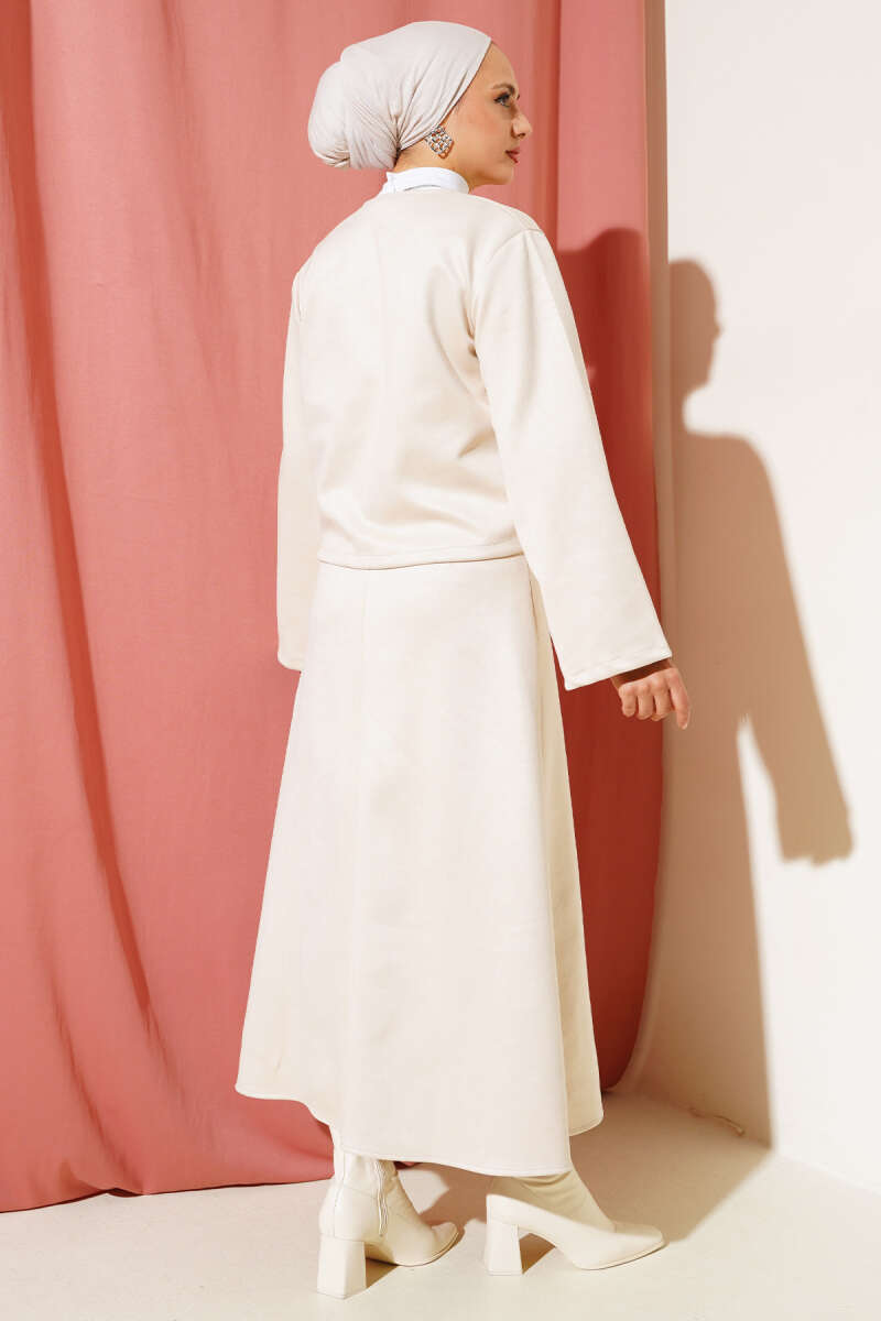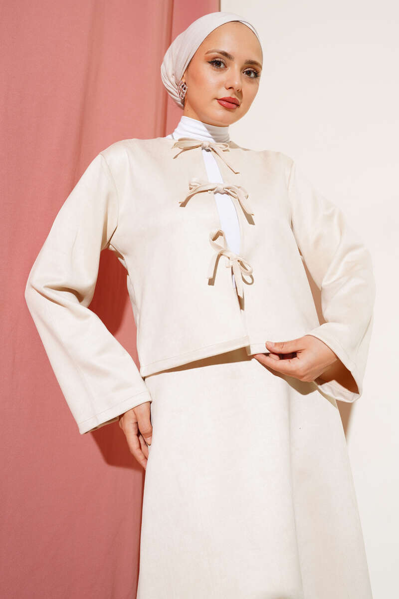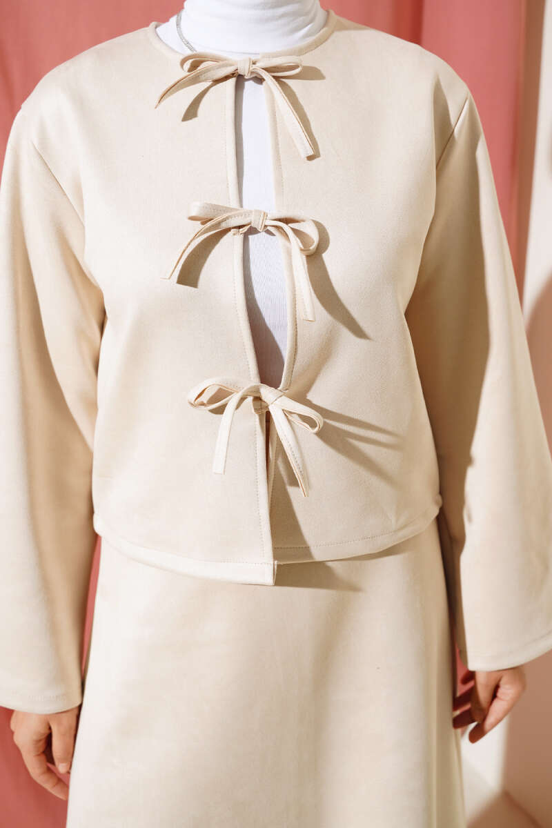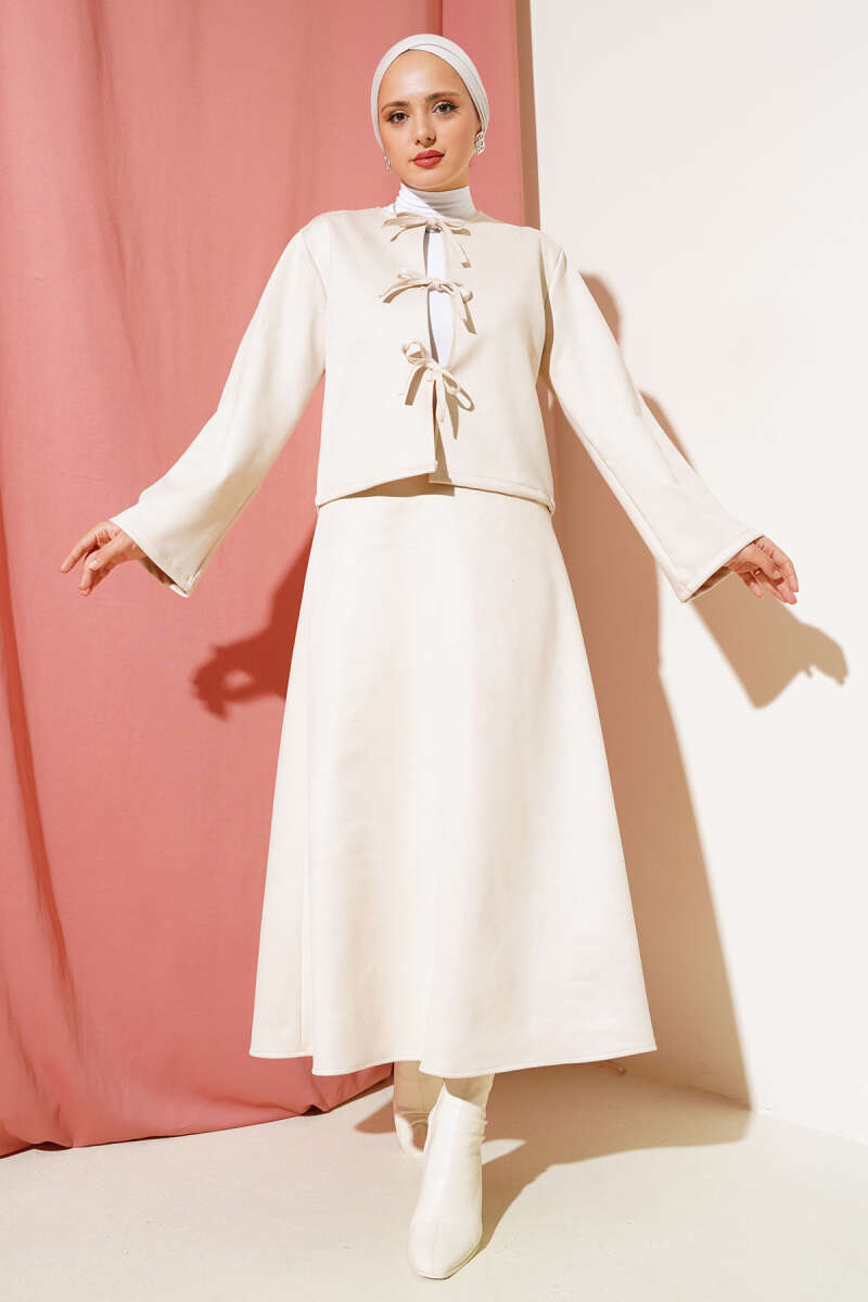 Önü Bağlamalı Etekli Süet İkili Takım Bej