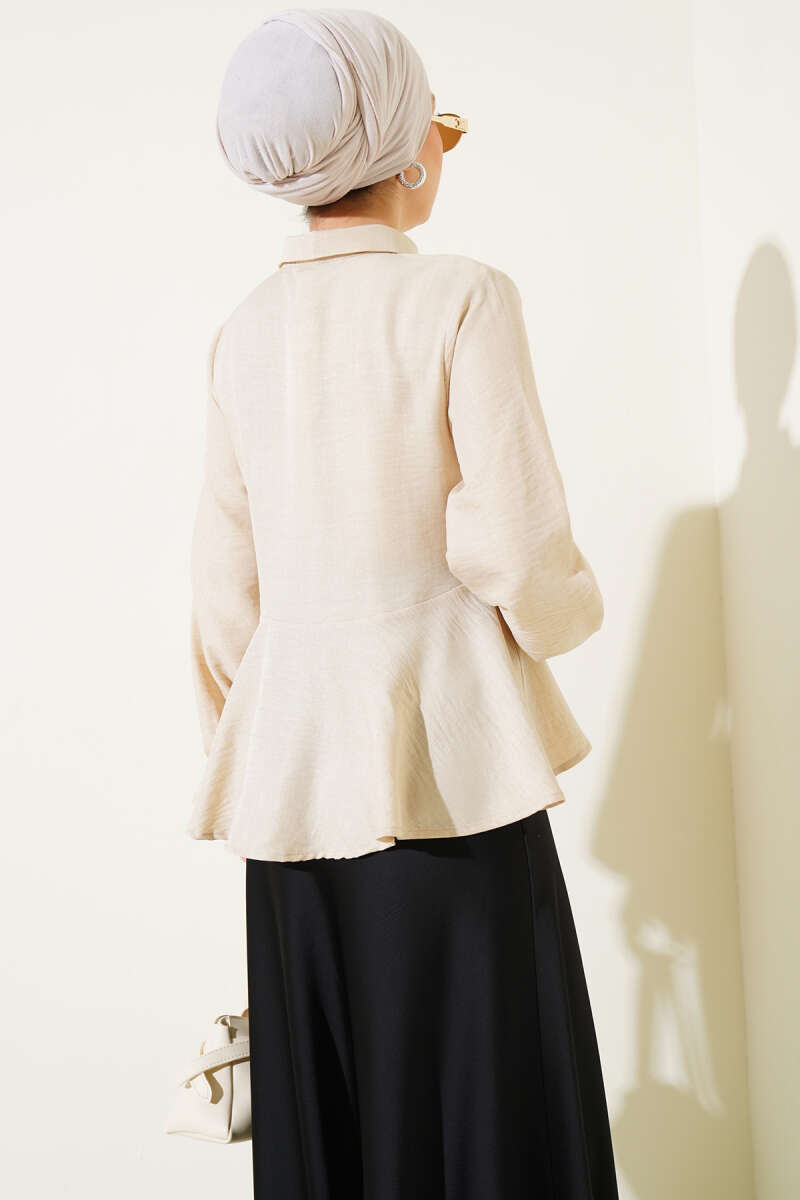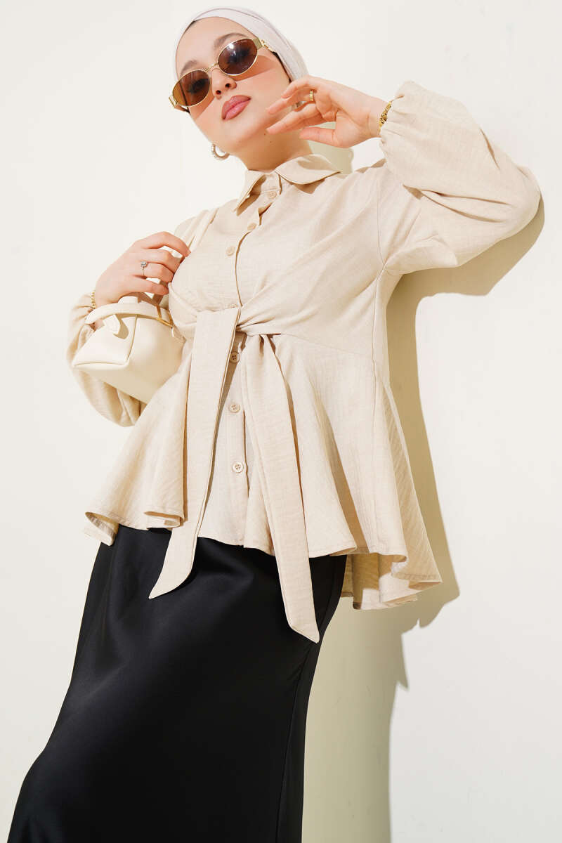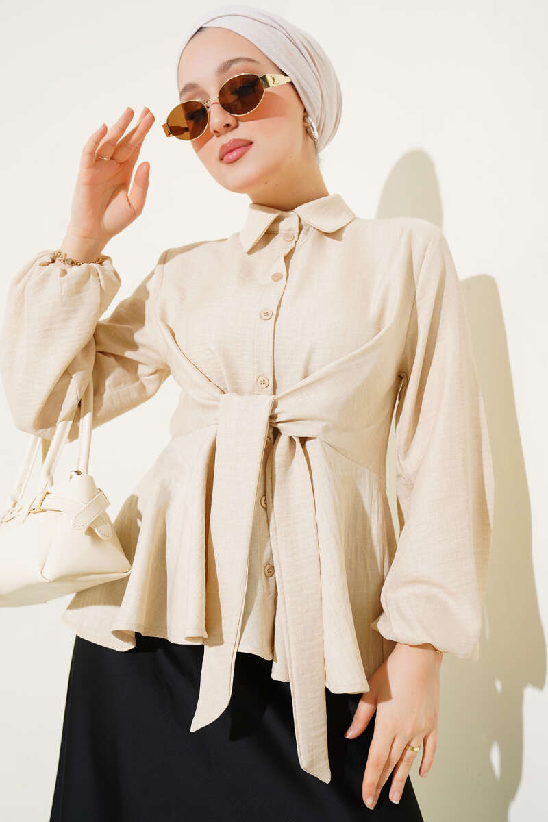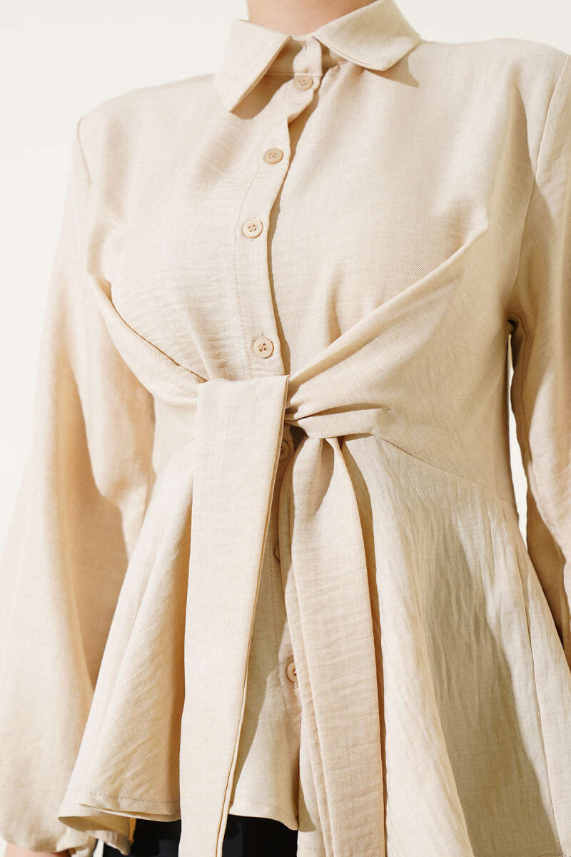 Tahta Düğmeli Ağaç Kabuğu Uzun Gömlek Bej