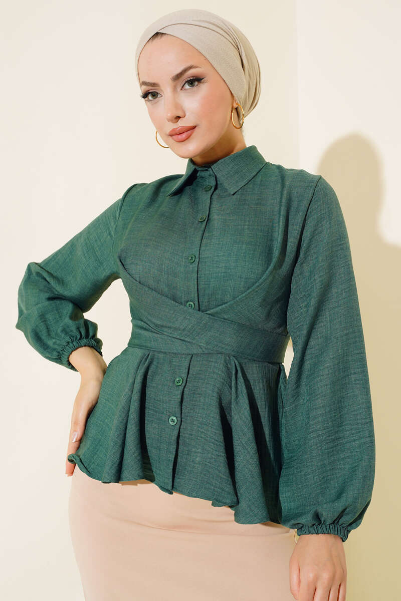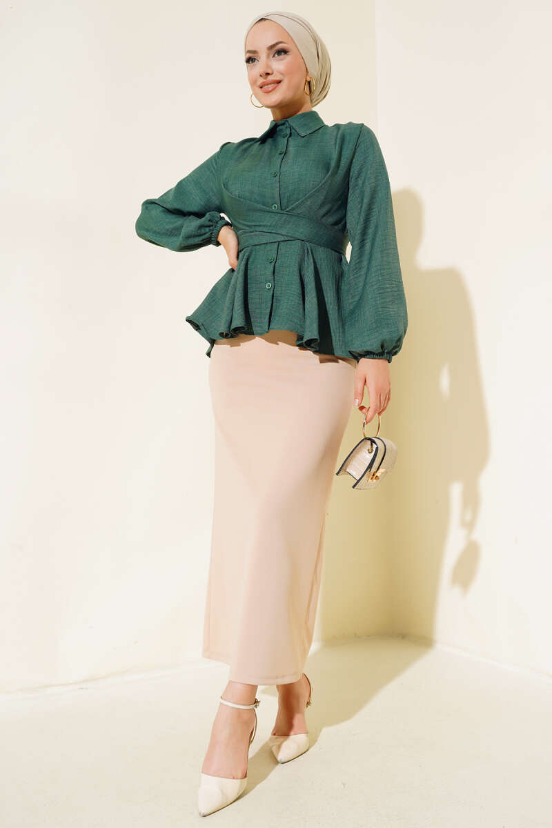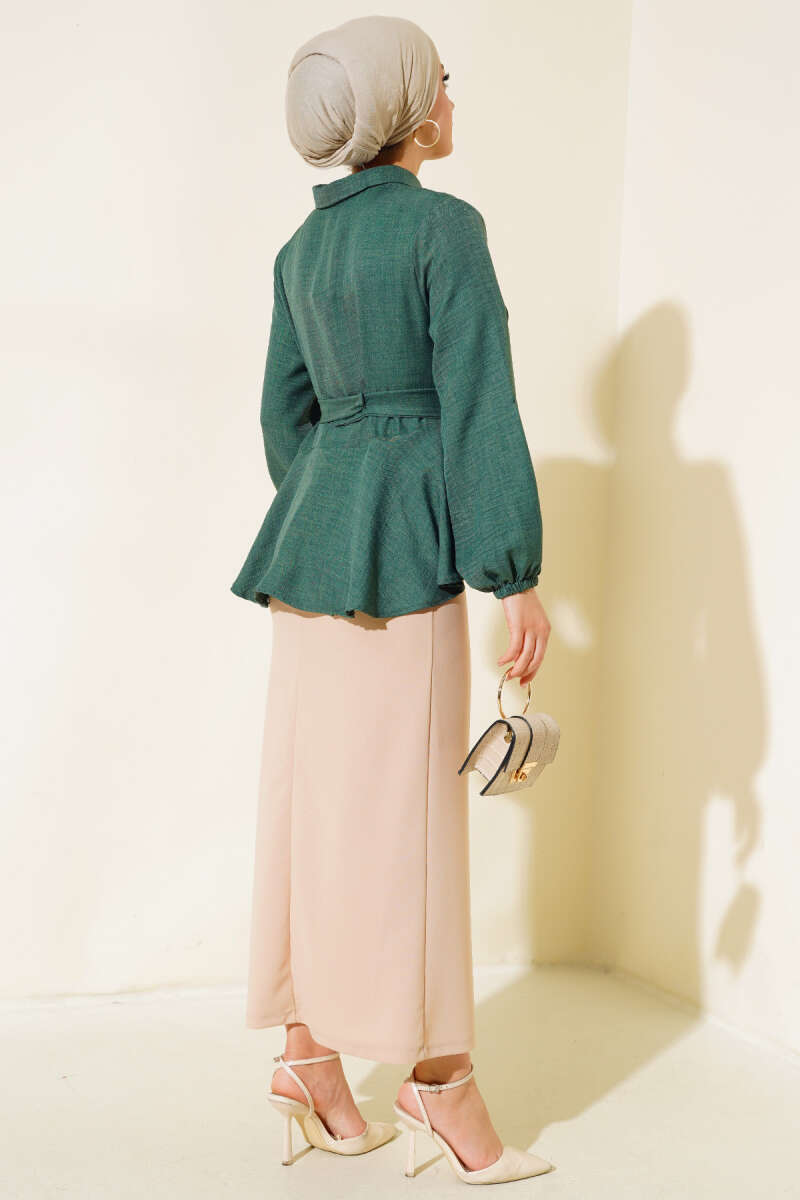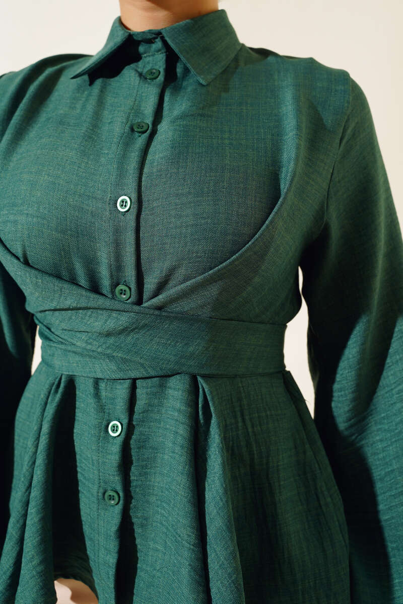 Tahta Düğmeli Ağaç Kabuğu Uzun Gömlek Zümrüt