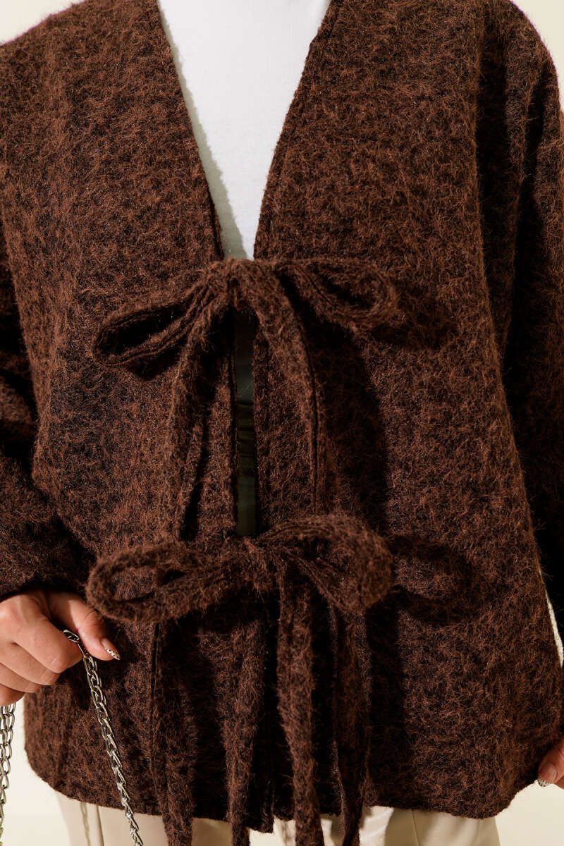 Fırfırlı İnci Düğmeli Triko Hırka Füme