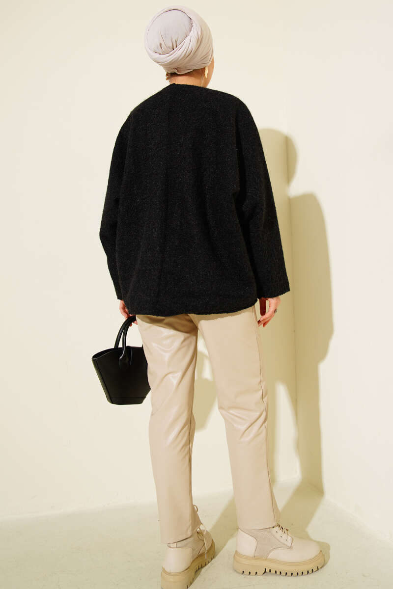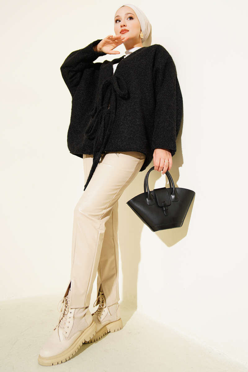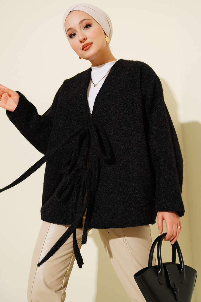 Kol Ribanalı Kuşaklı Tay Tüyü Kaban Siyah