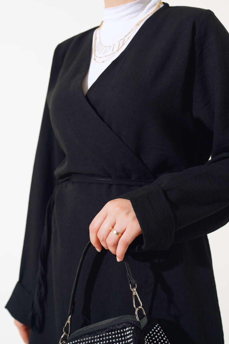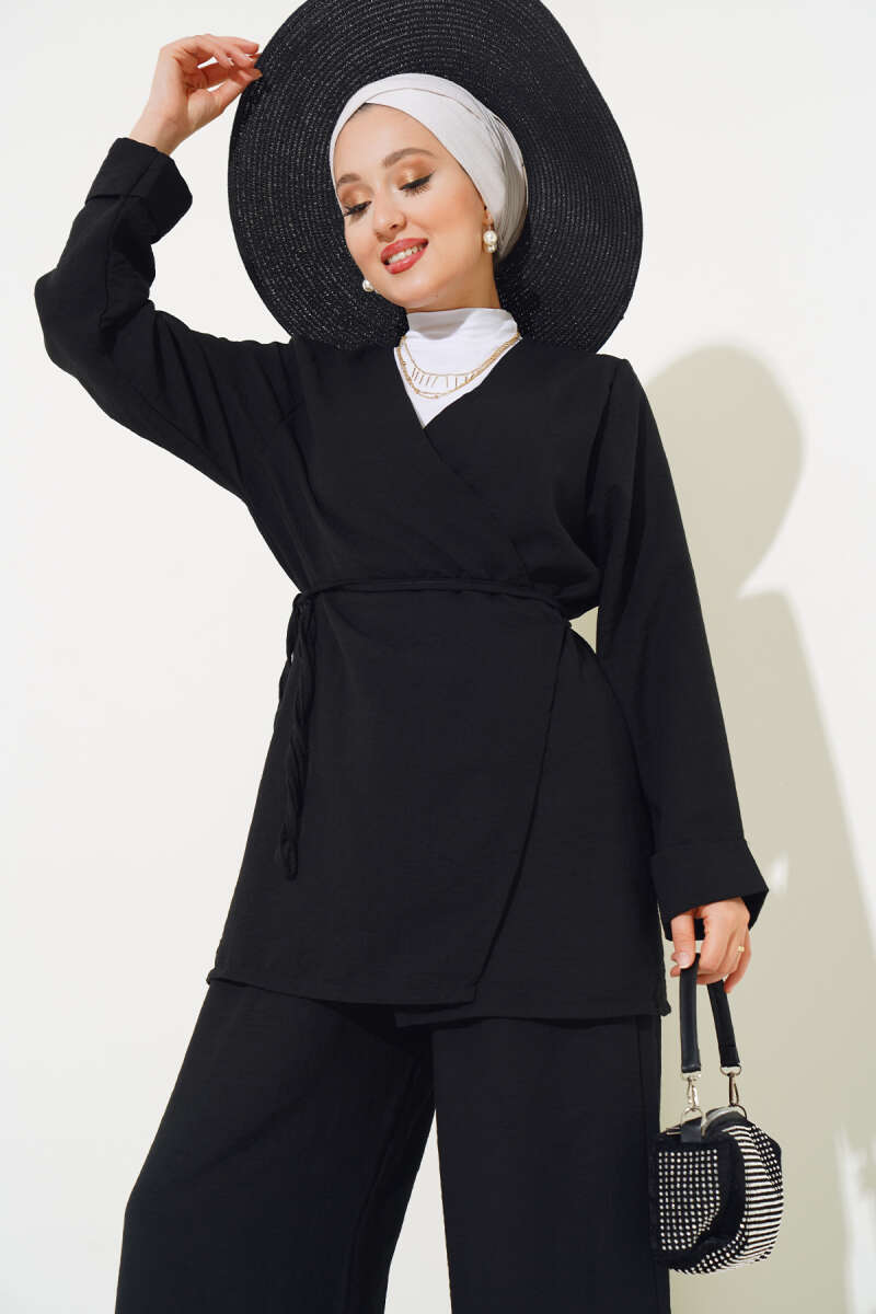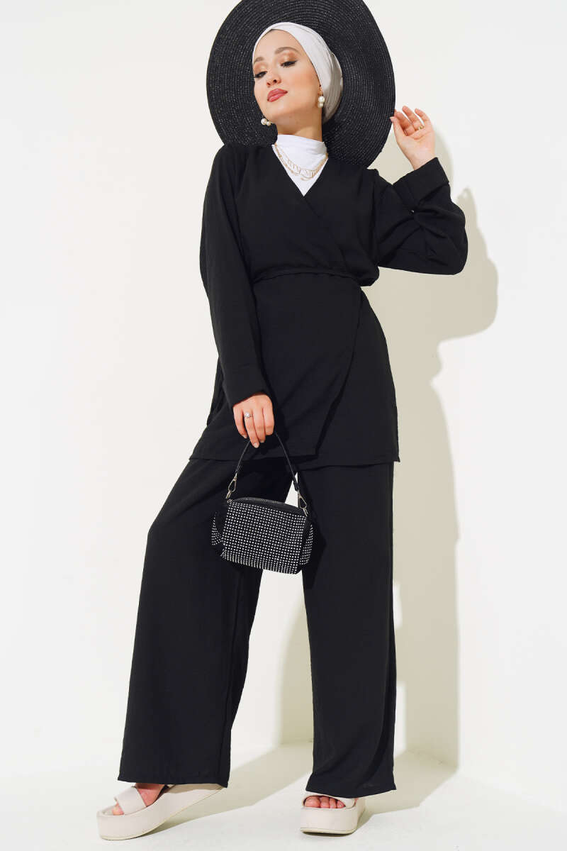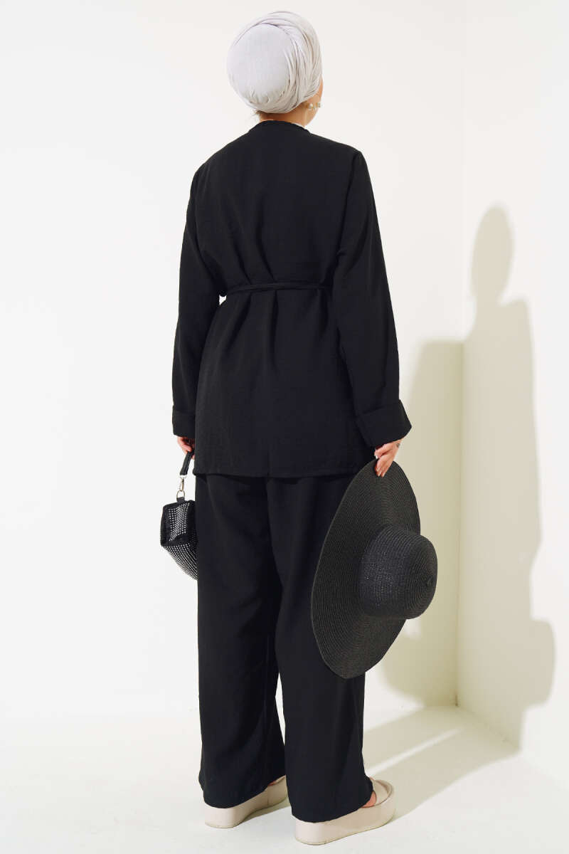 Önü Bağlamalı Keten Kimono Takım Siyah