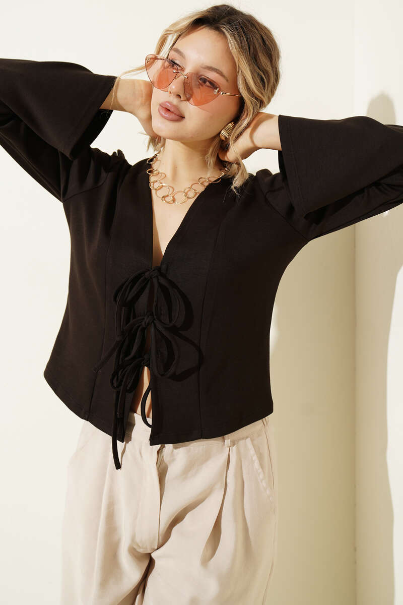 Modern ve minimal bir tasarıma sahip olan bu hırka, ön kısmındaki üçlü bağlama detayıyla stilinize zarif bir dokunuş katıyor. V yaka kesimi ve dikey dikiş hatları, silüeti daha fit ve uzun gösteren bir form sunarken geniş kol yapısı hareket özgürlüğü sağlıyor.
