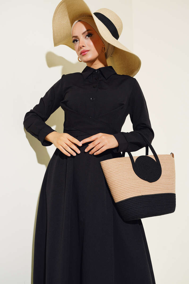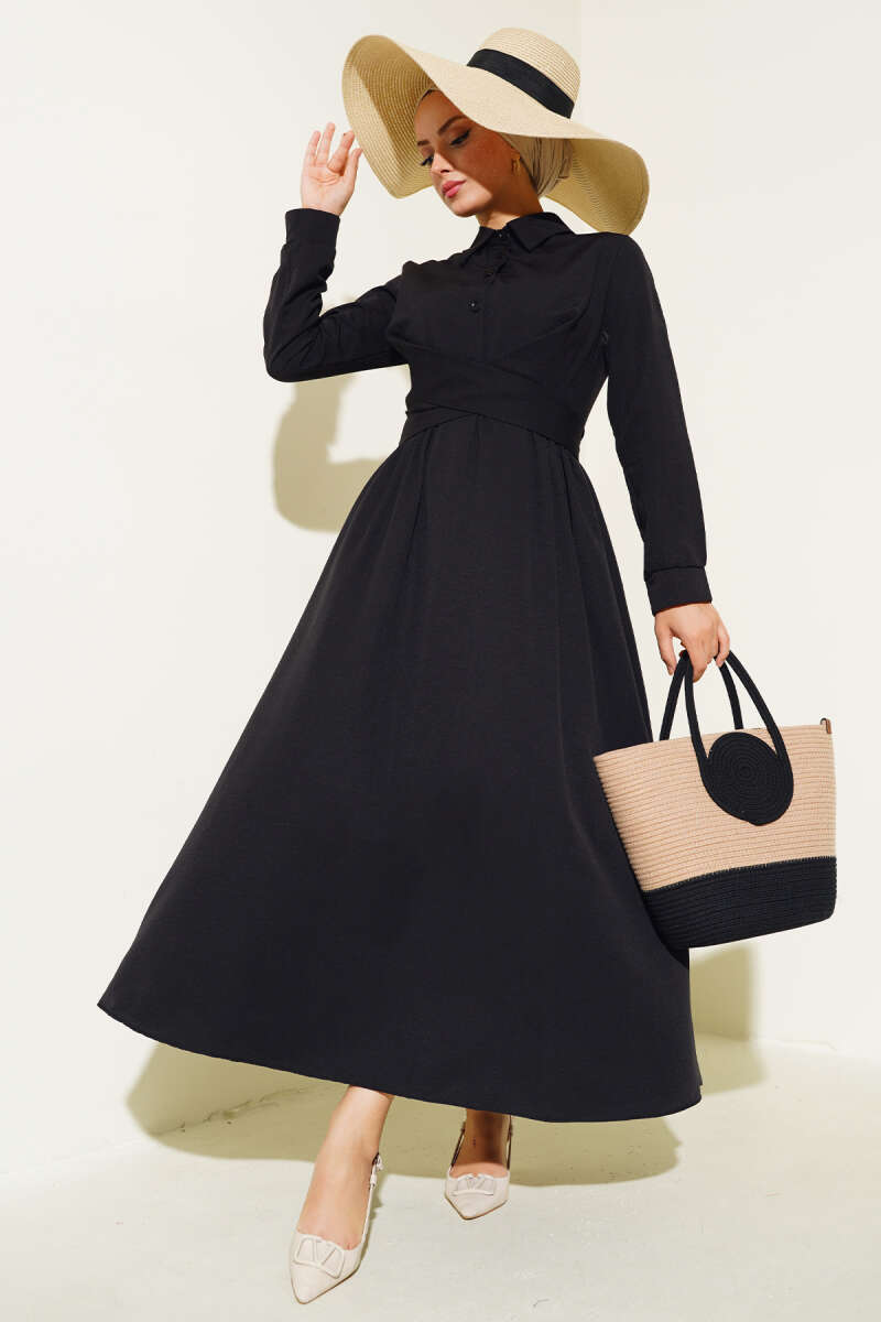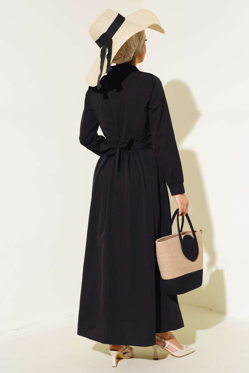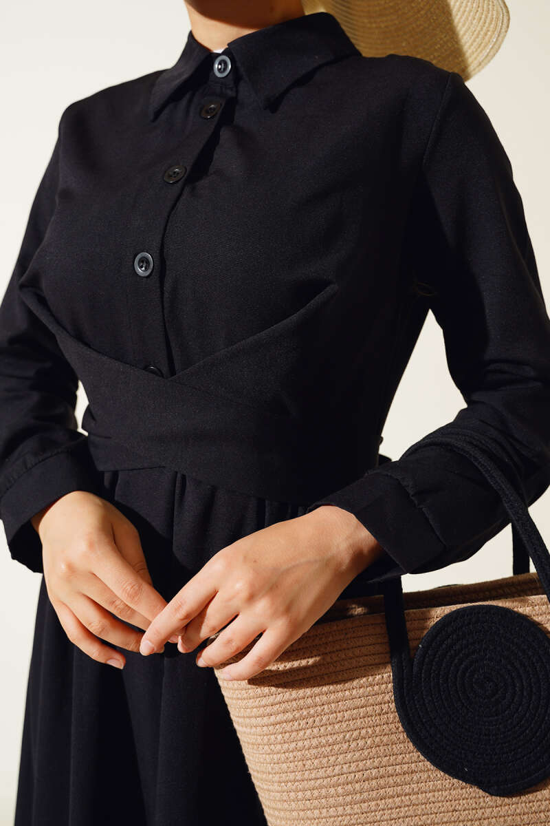 Önü Bağlamalı Yarım Düğmeli Elbise Siyah
