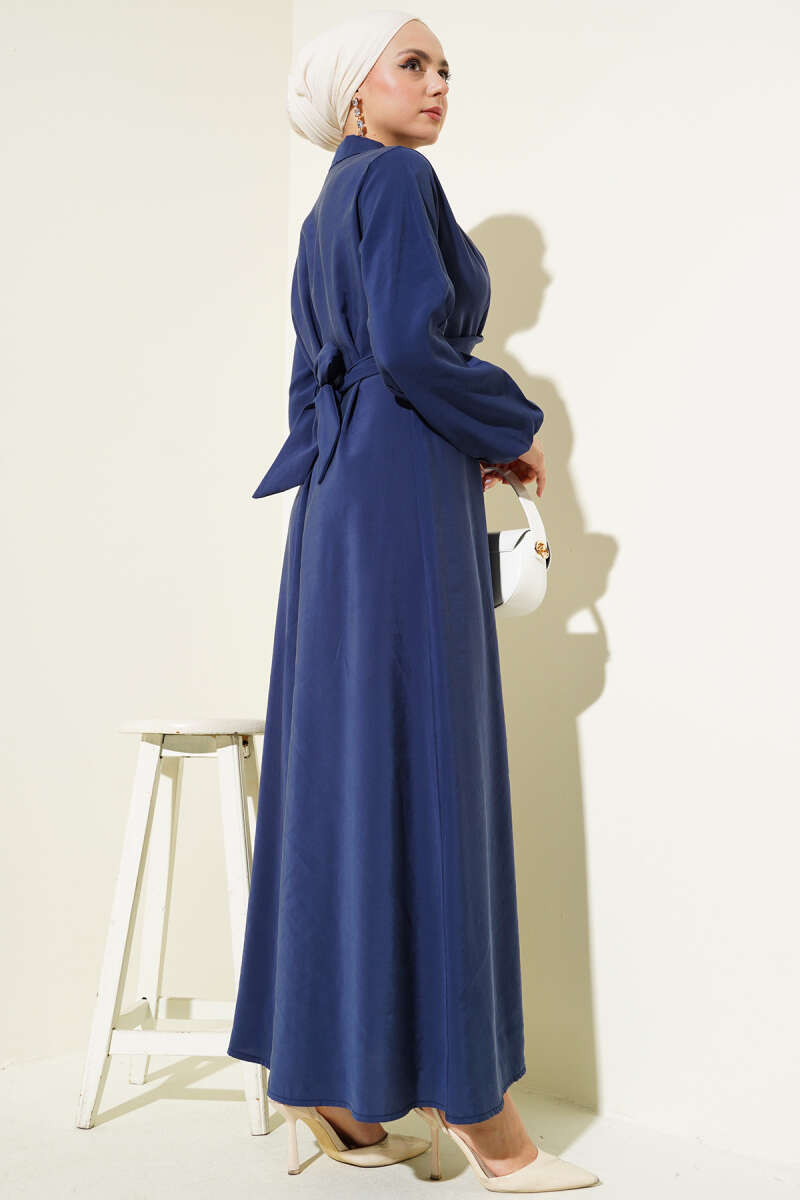 Fırfır Detaylı Kuşaklı Elbise İndigo