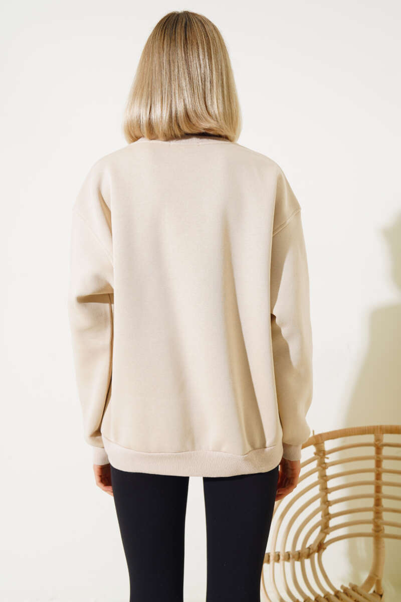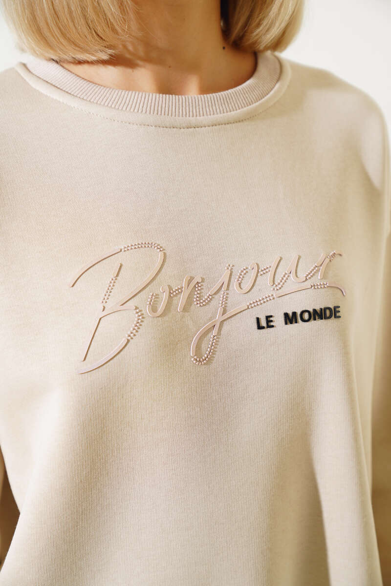 Önü Baskılı Üç İplik Sweatshirt Bej