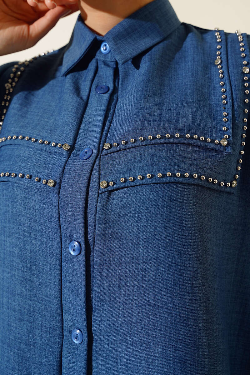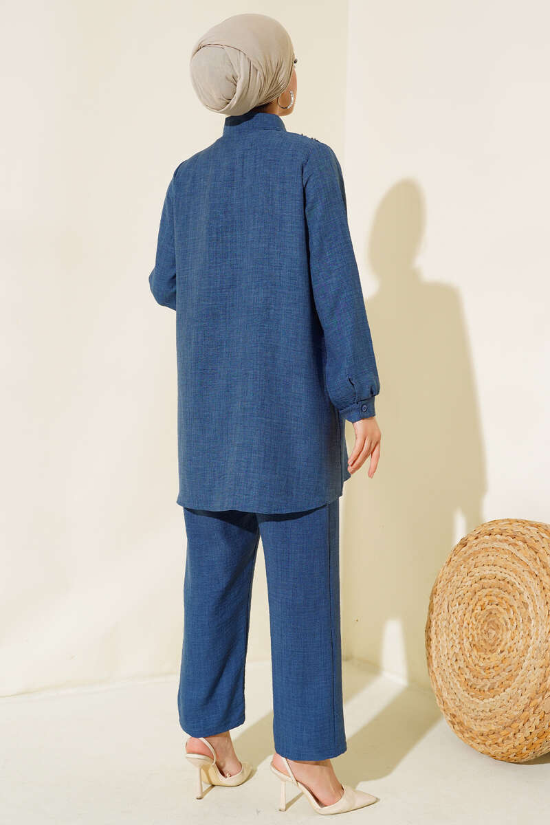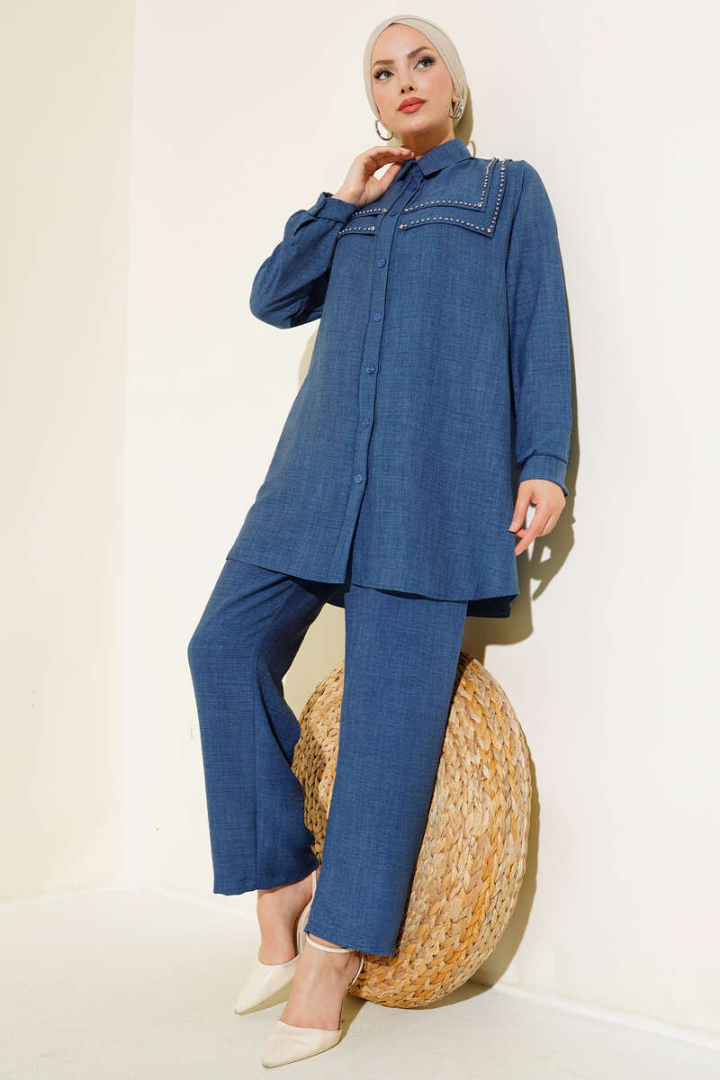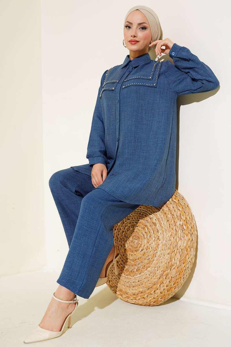 Önü Boncuk Detaylı Keten İkili Takım İndigo