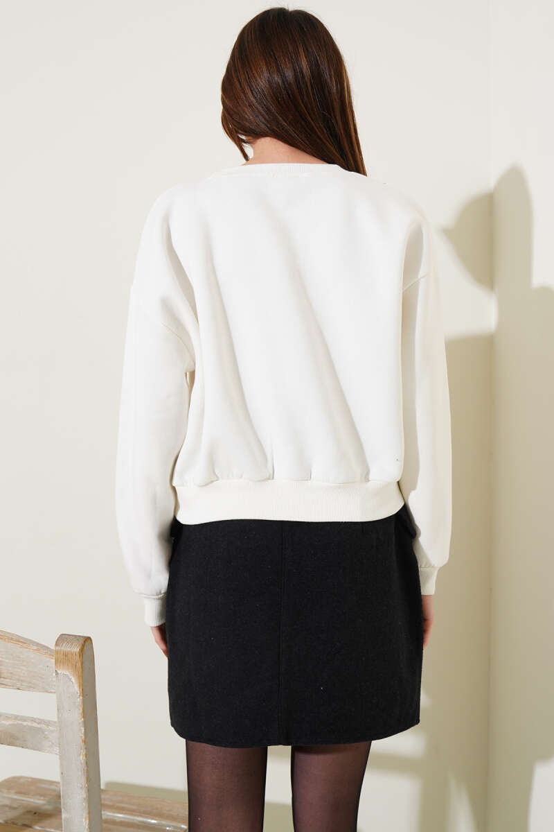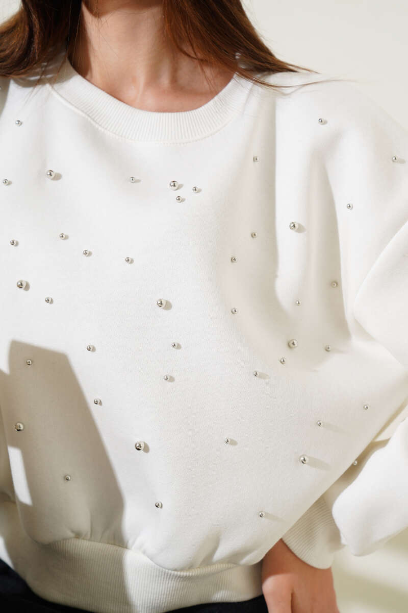Önü Boncuklu Üç İplik Kısa Sweatshirt Ekru
