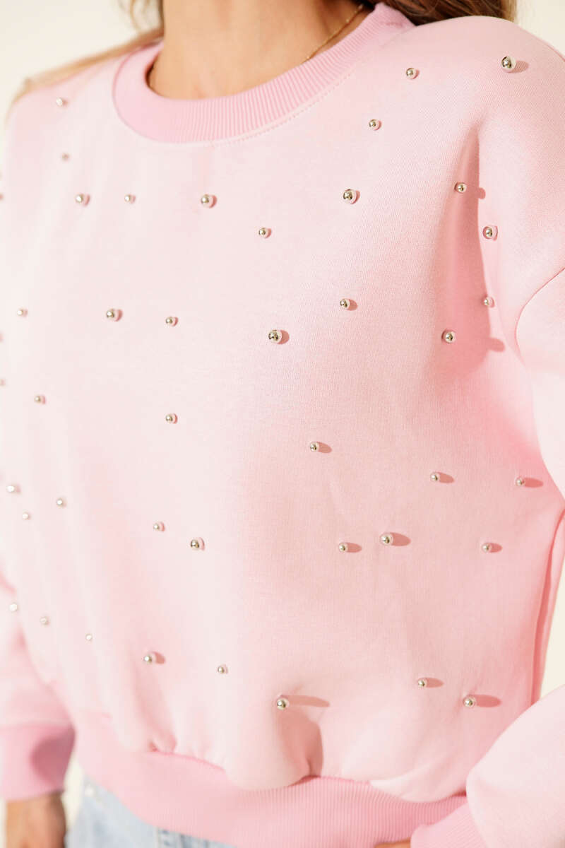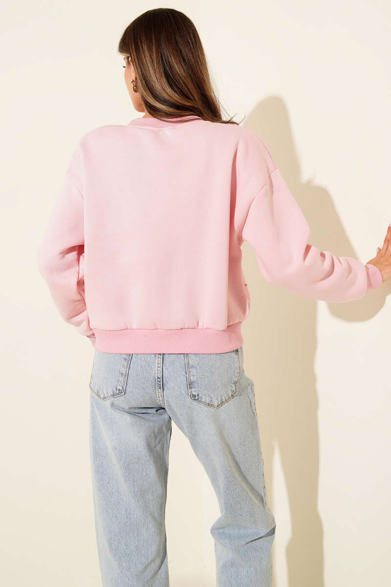Dik Yaka Taşlı Triko Kazak Pembe