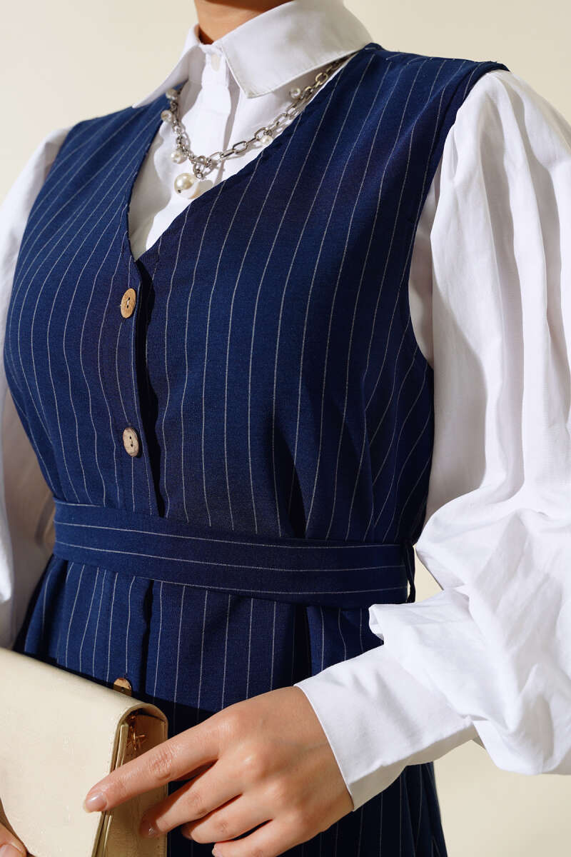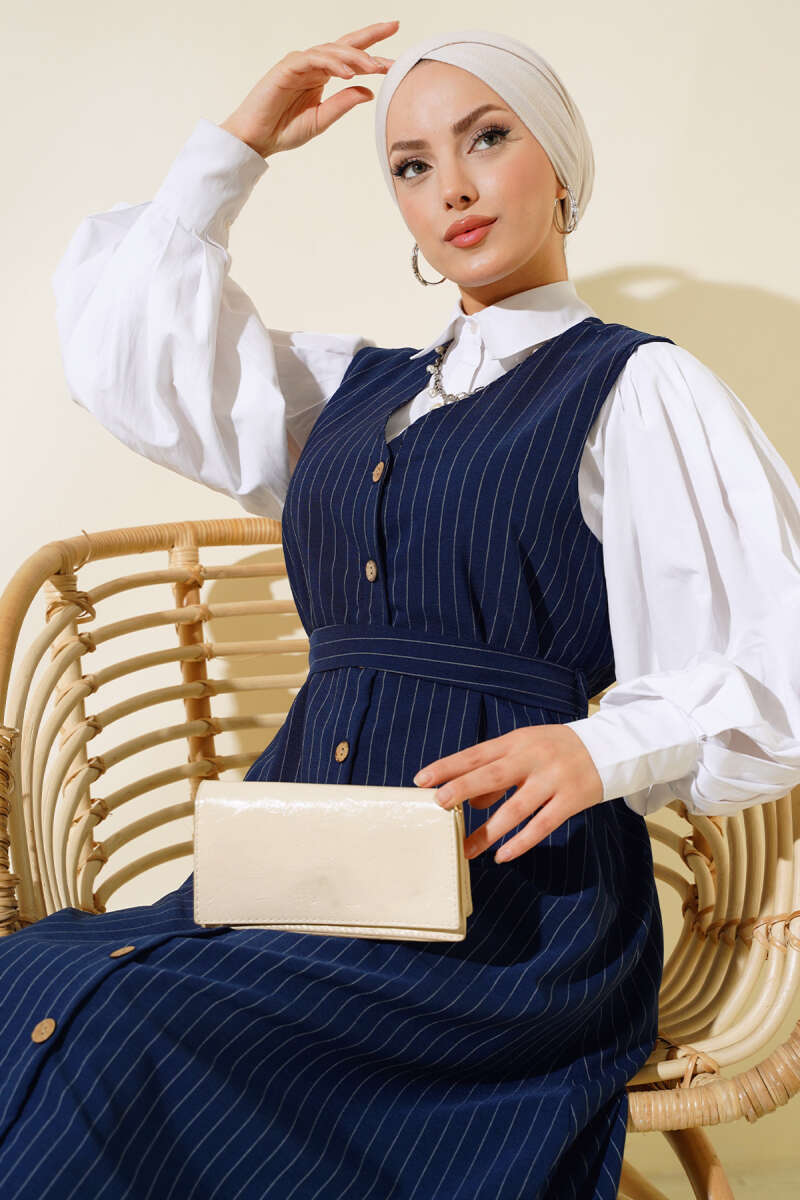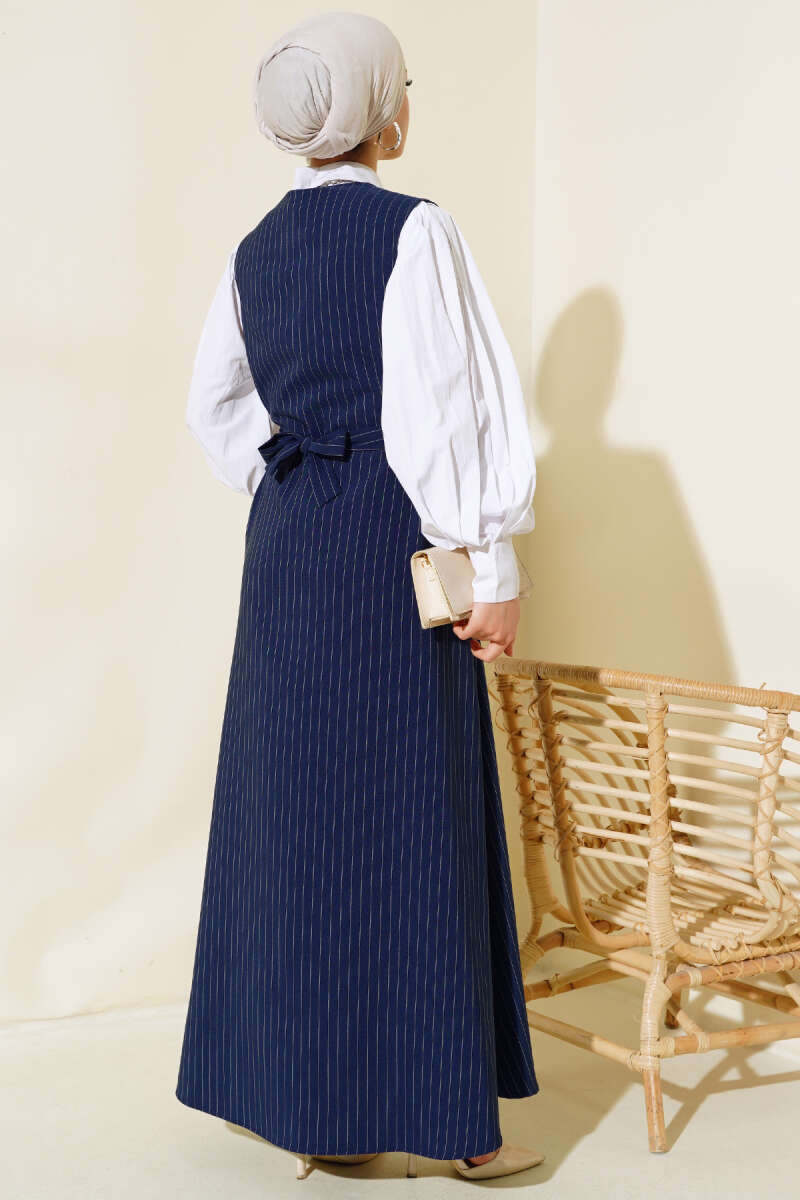 Önü Boydan Düğmeli Çizgili Jile Elbise Lacivert