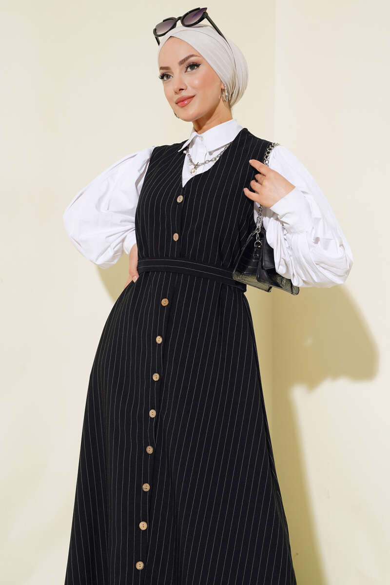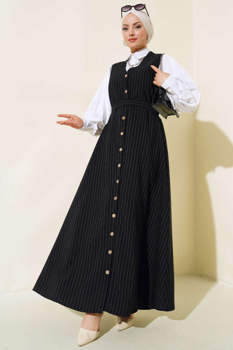 Yeni sezon jile elbisemiz şık duruşuyla sizlerle beraber. Jilemizin önü boydan düğmelidir. V yakadır. Jilemizin belinde iki adet kemer köprüsü olup, bir adet kendi kumaşından kuşağı vardır. Kloş modeldir. Jile elbisemiz renk seçenekleriyle sizlerle beraber.
