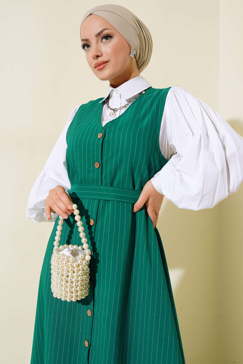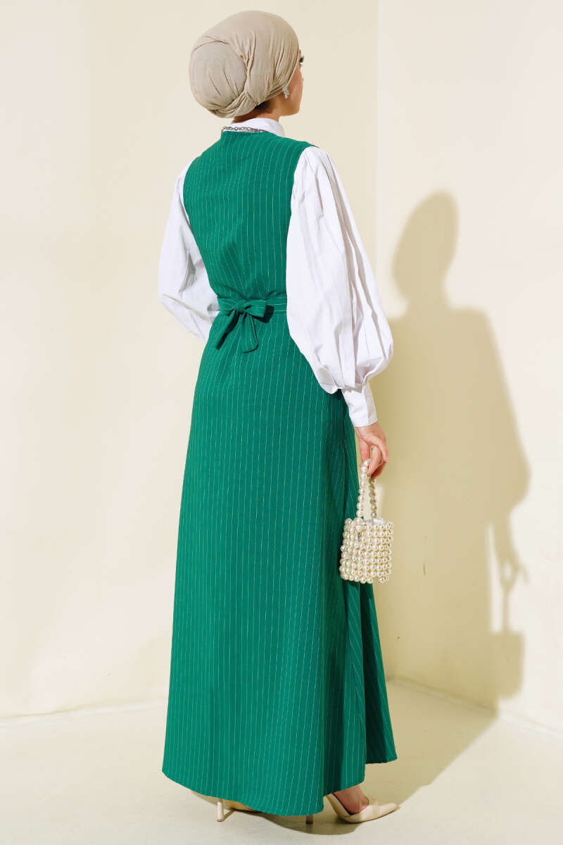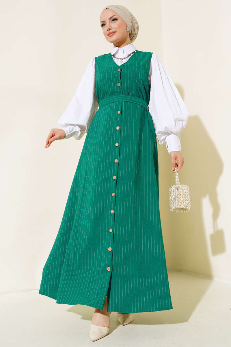 Önü Boydan Düğmeli Çizgili Jile Elbise Yeşil