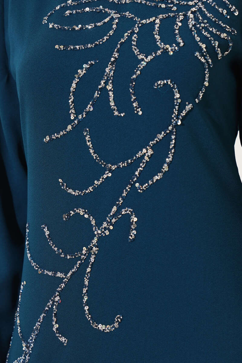 Kol Ucu Püsküllü Saten Abiye Elbise Lacivert