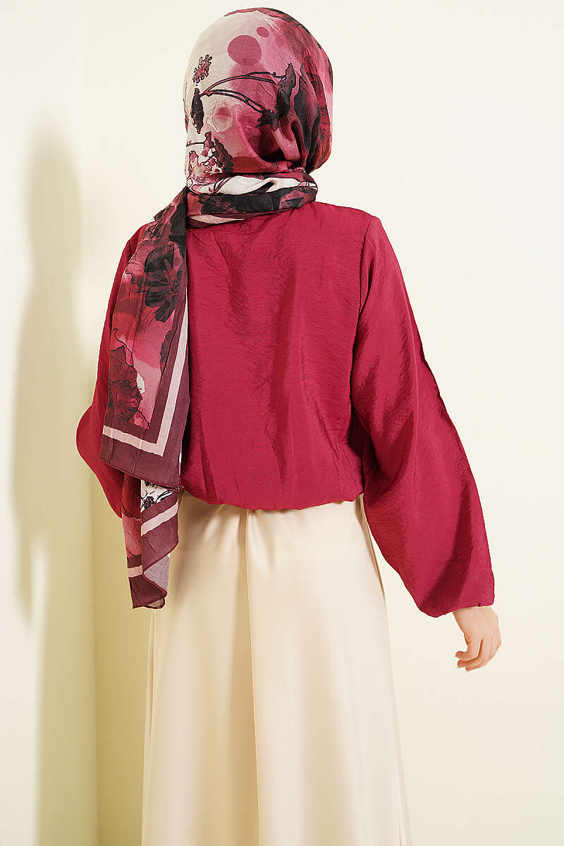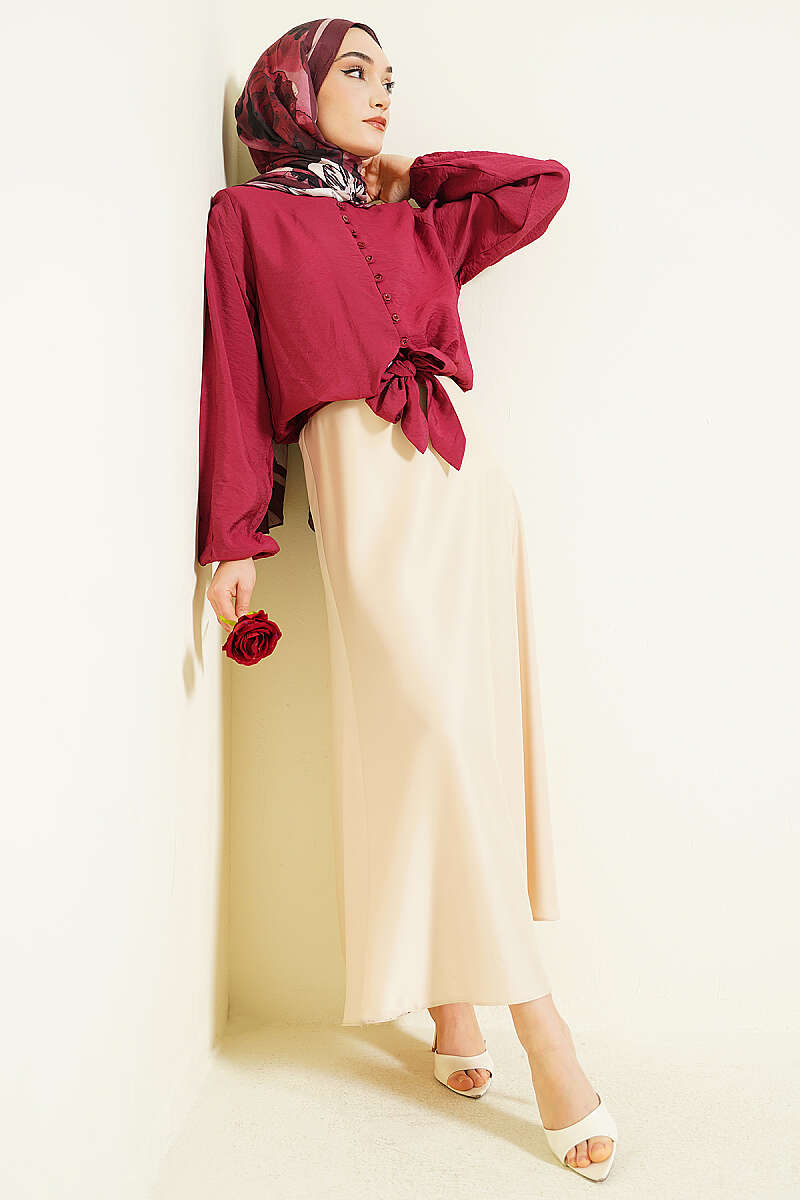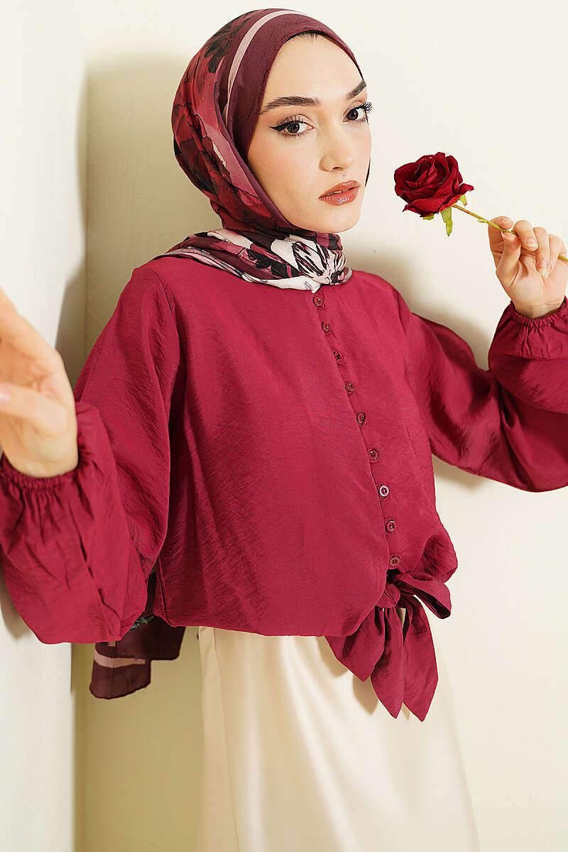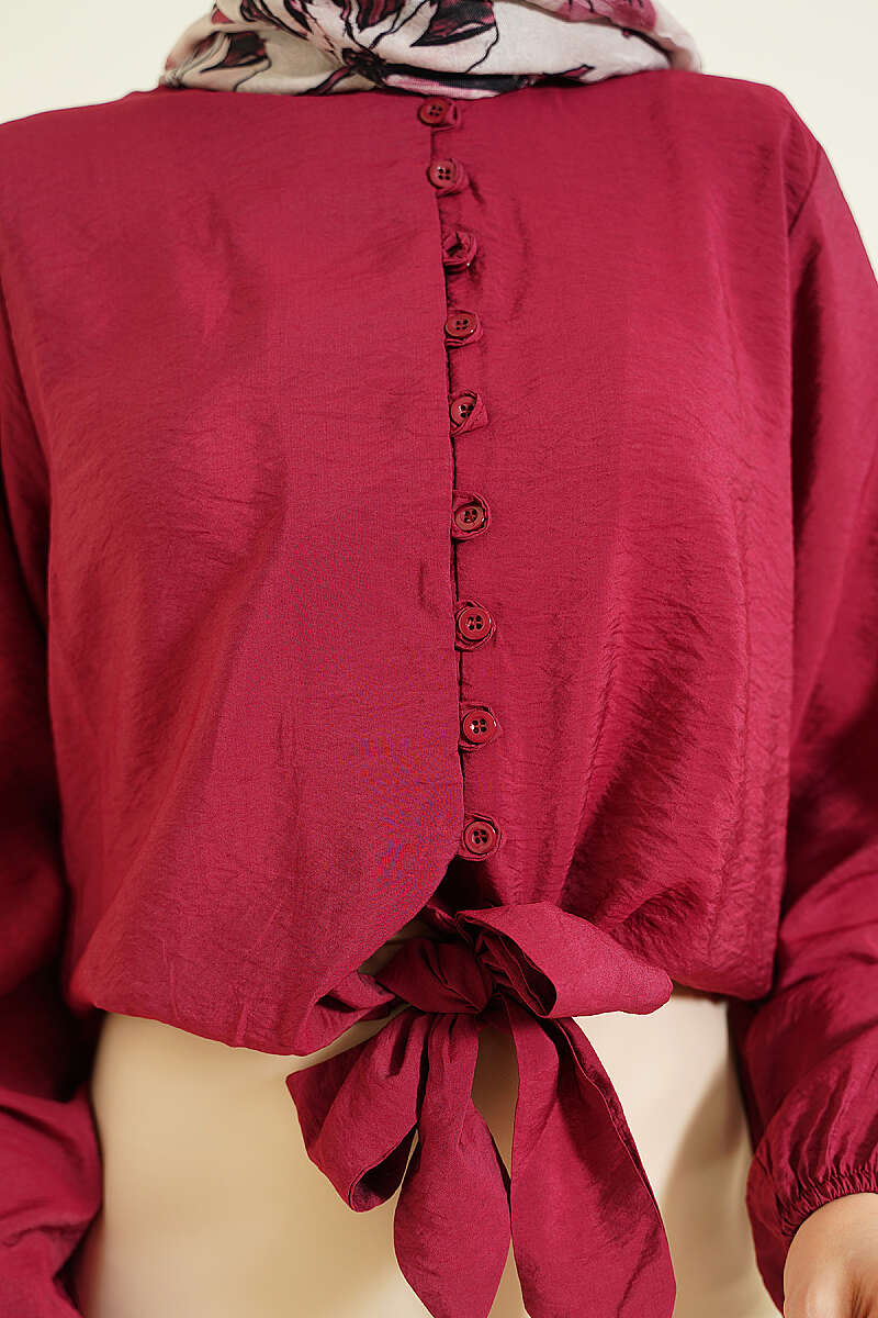 Önü Brit Düğmeli Bağlamalı Kısa Gömlek Bordo