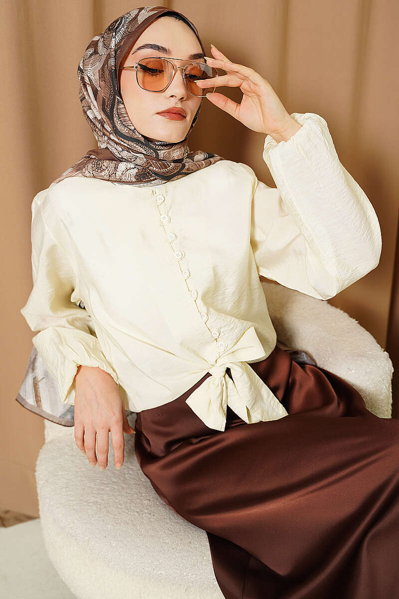 Önü Brit Düğmeli Bağlamalı Kısa Gömlek Krem