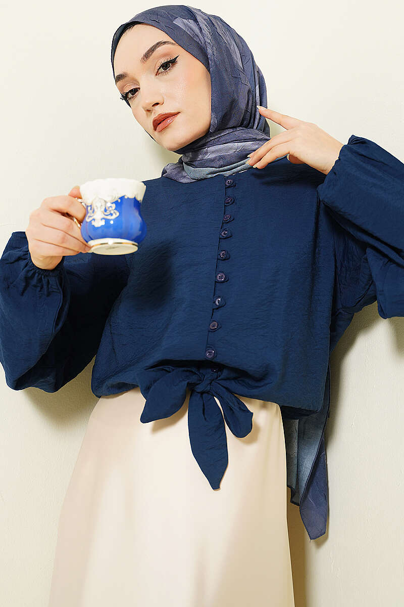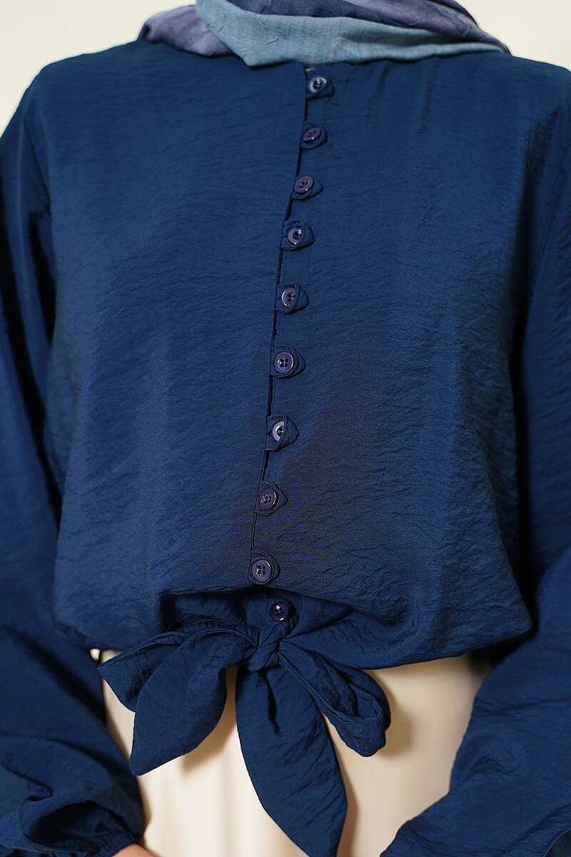 Önü Brit Düğmeli Bağlamalı Kısa Gömlek Lacivert