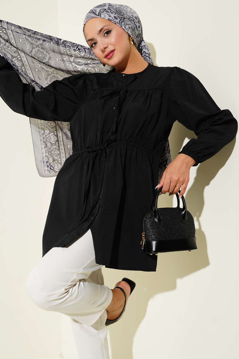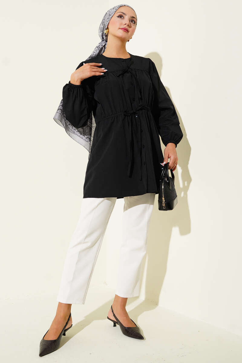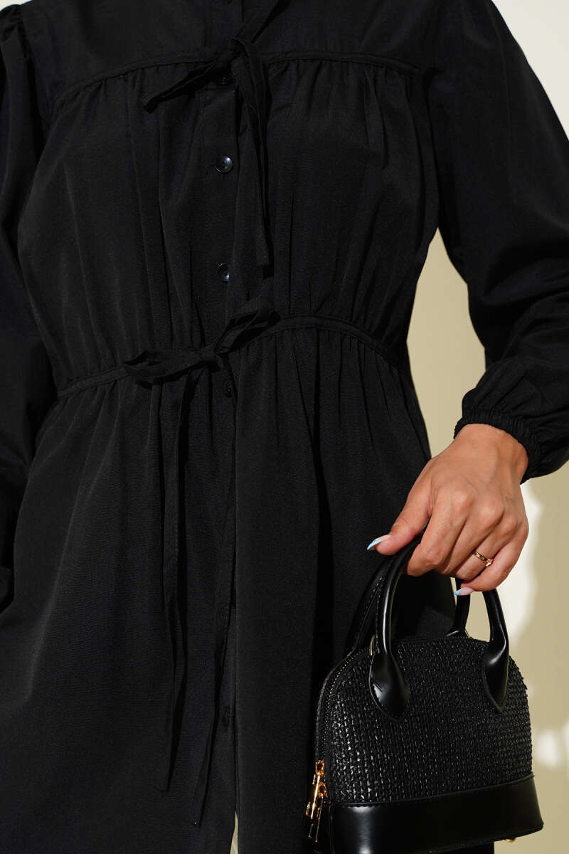 Gömlek Yaka İp Kuşaklı Deri Ceket Siyah