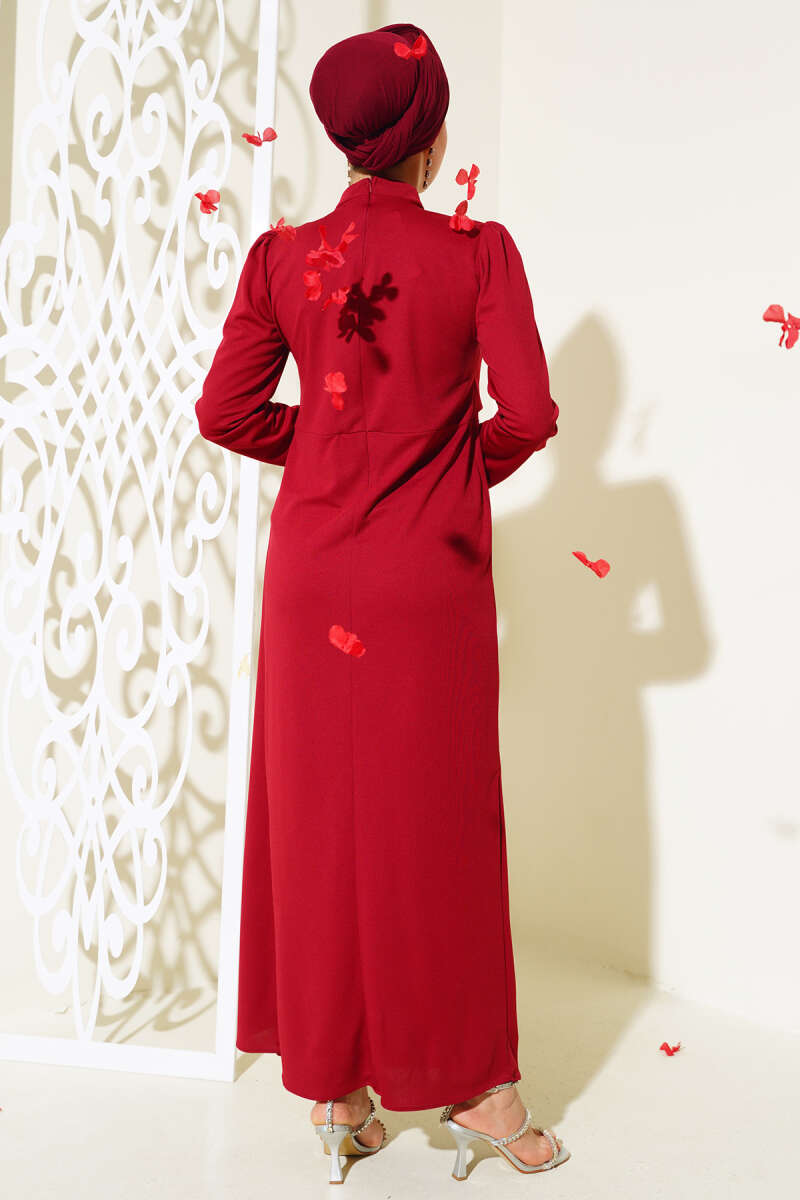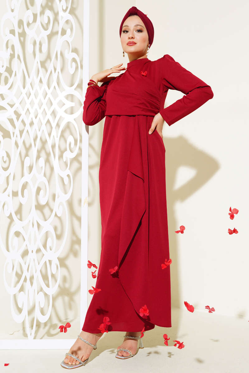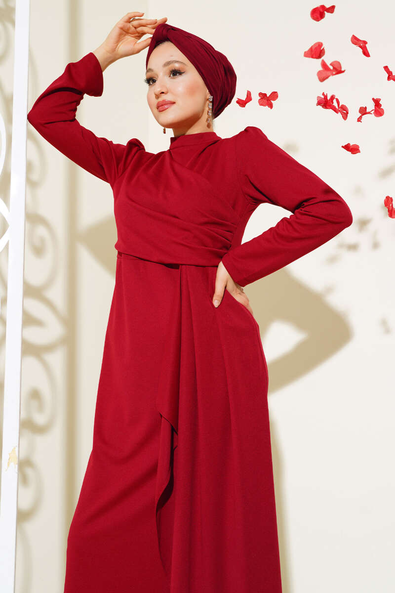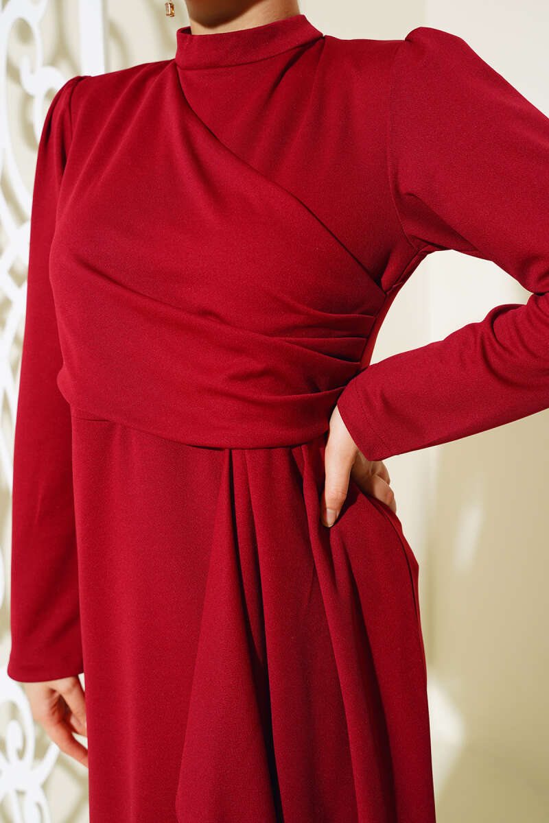 Pelerin Detaylı Pileli Triko Elbise Bordo