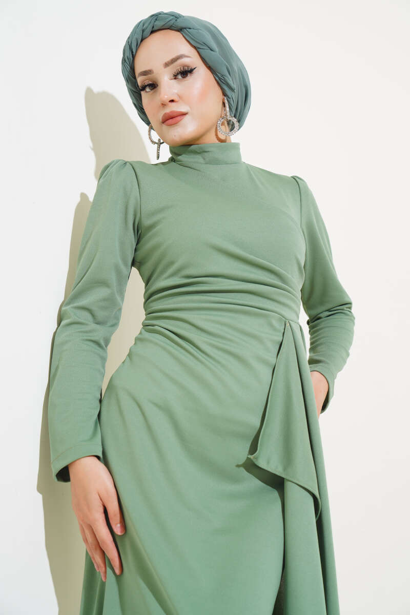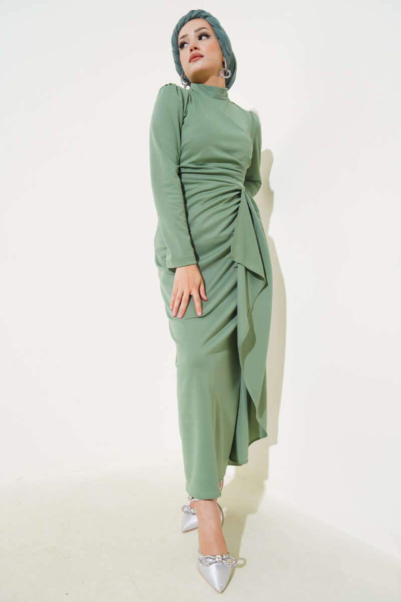 Gül Detaylı Pelerinli Abiye Elbise Haki