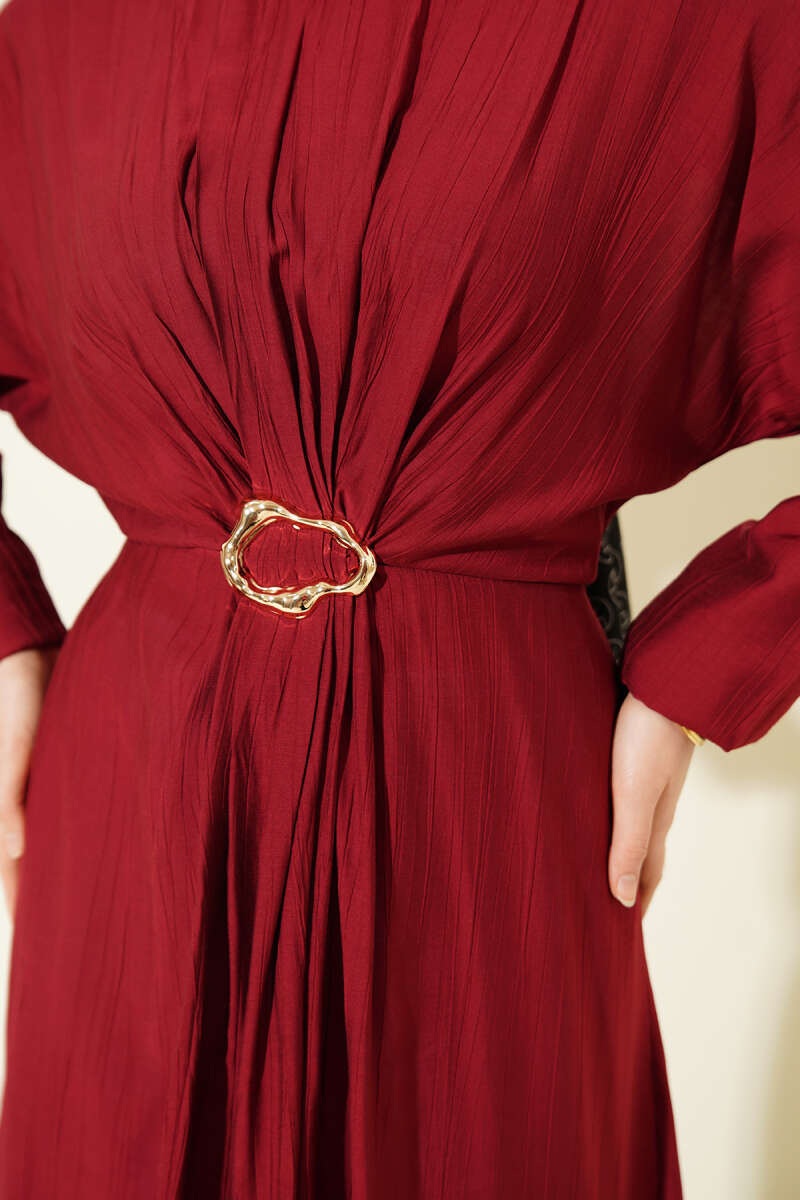 Önü Büzgülü Gold Tokalı Elbise Bordo