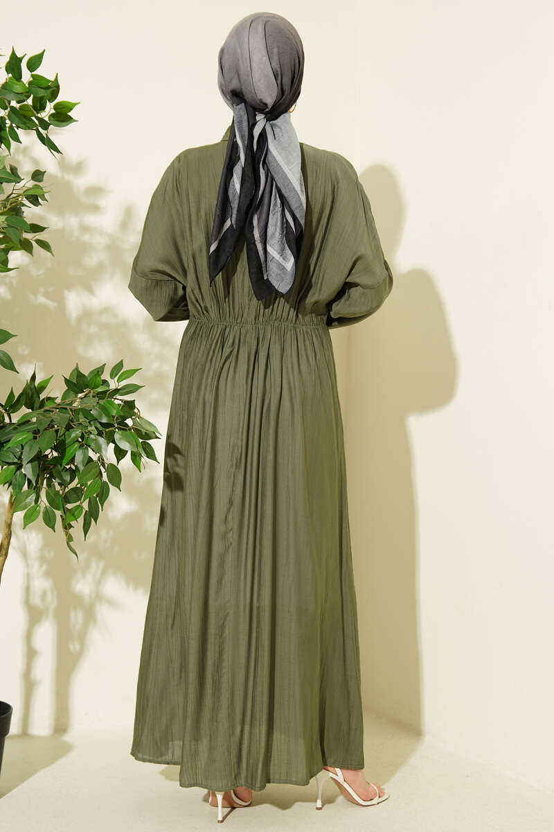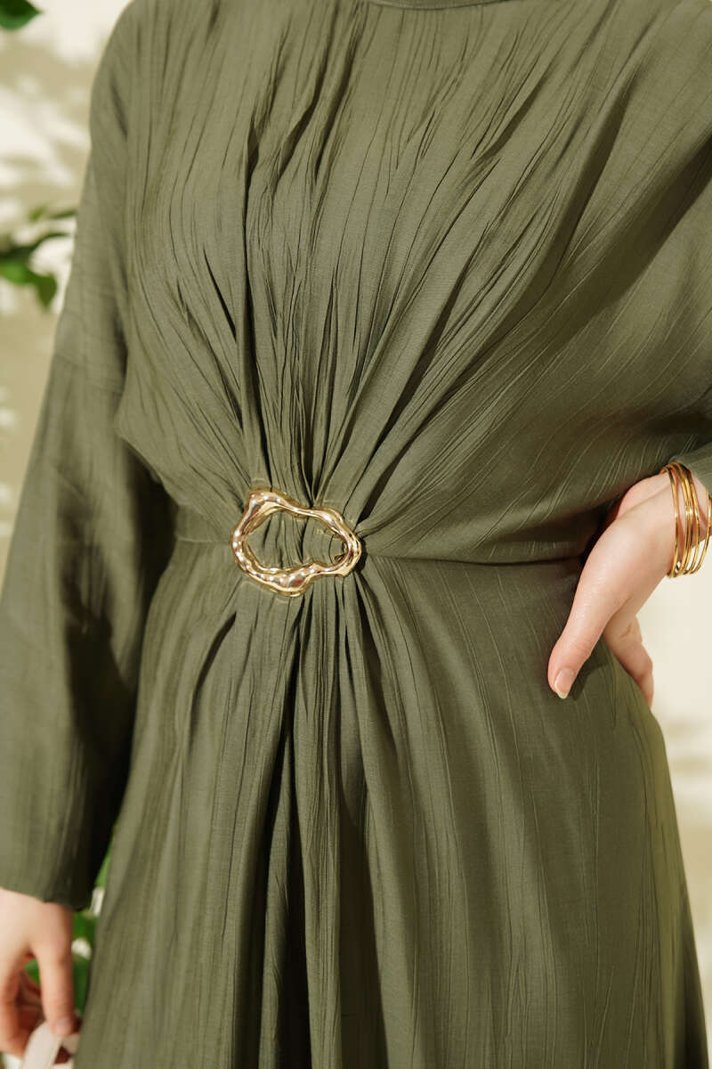 Önü Büzgülü Gold Tokalı Elbise Haki