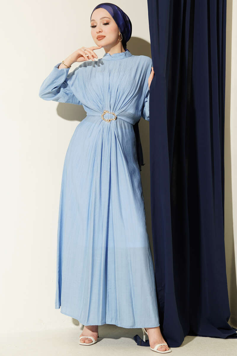 Önü Büzgülü Gold Tokalı Elbise Mavi