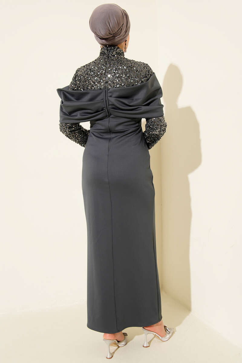 Önü Büzgülü Pul Payet Abiye Elbise Siyah