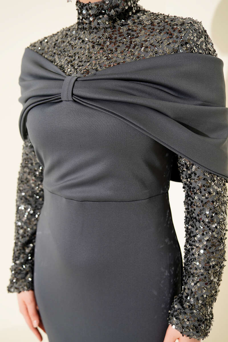 Önü Büzgülü Pul Payet Abiye Elbise Haki