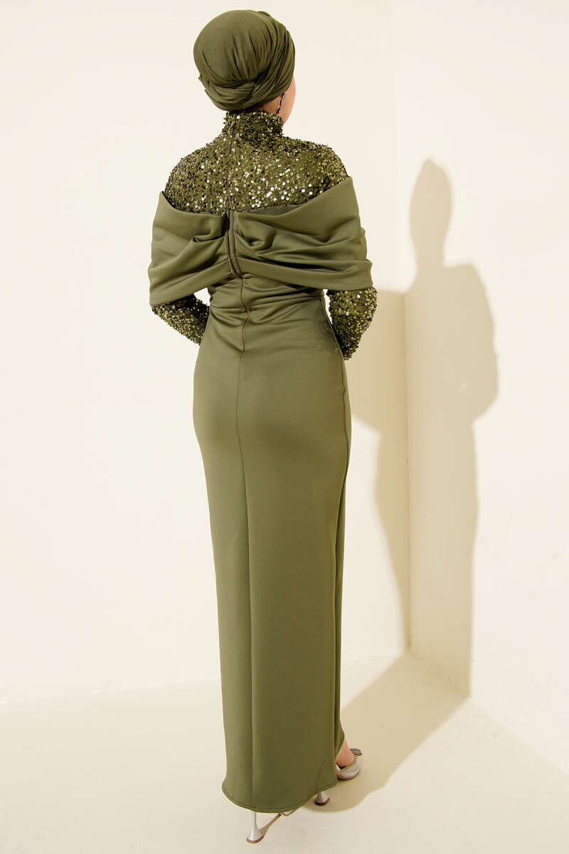 Önü Büzgülü Pul Payet Abiye Elbise Haki