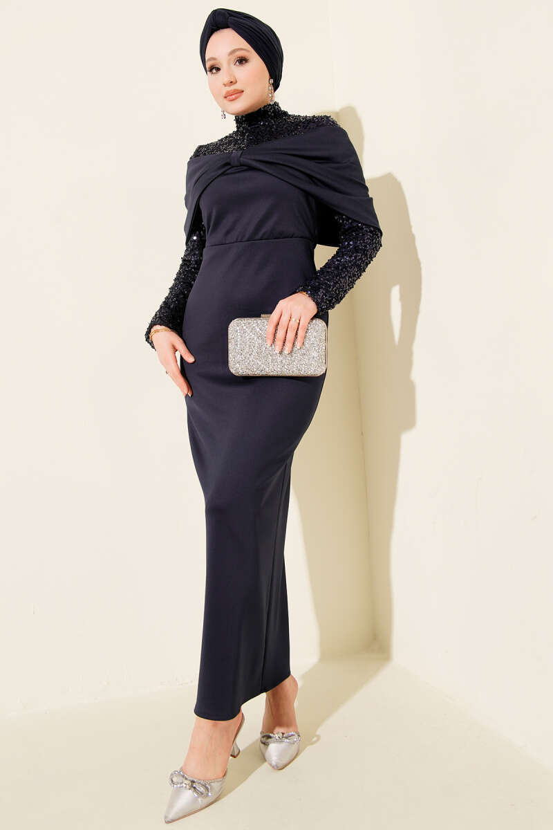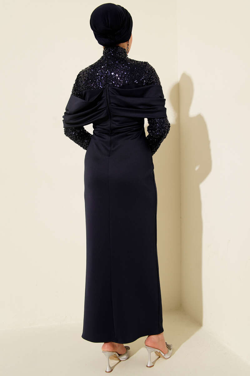 Önü Büzgülü Pul Payet Abiye Elbise Siyah