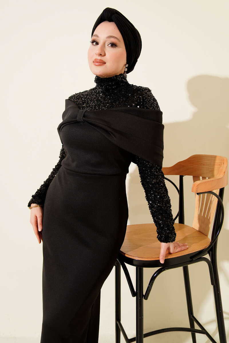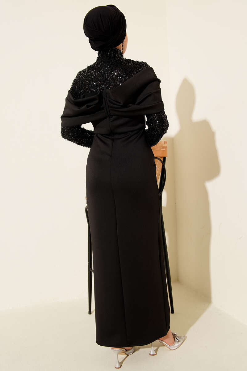Kolları Fiyonk Detaylı Selanik Elbise Siyah