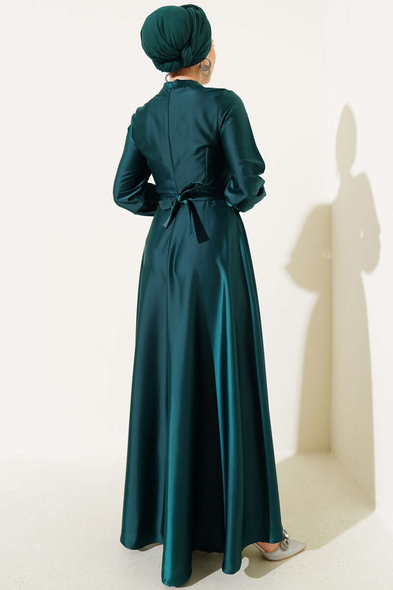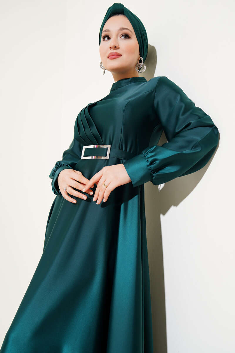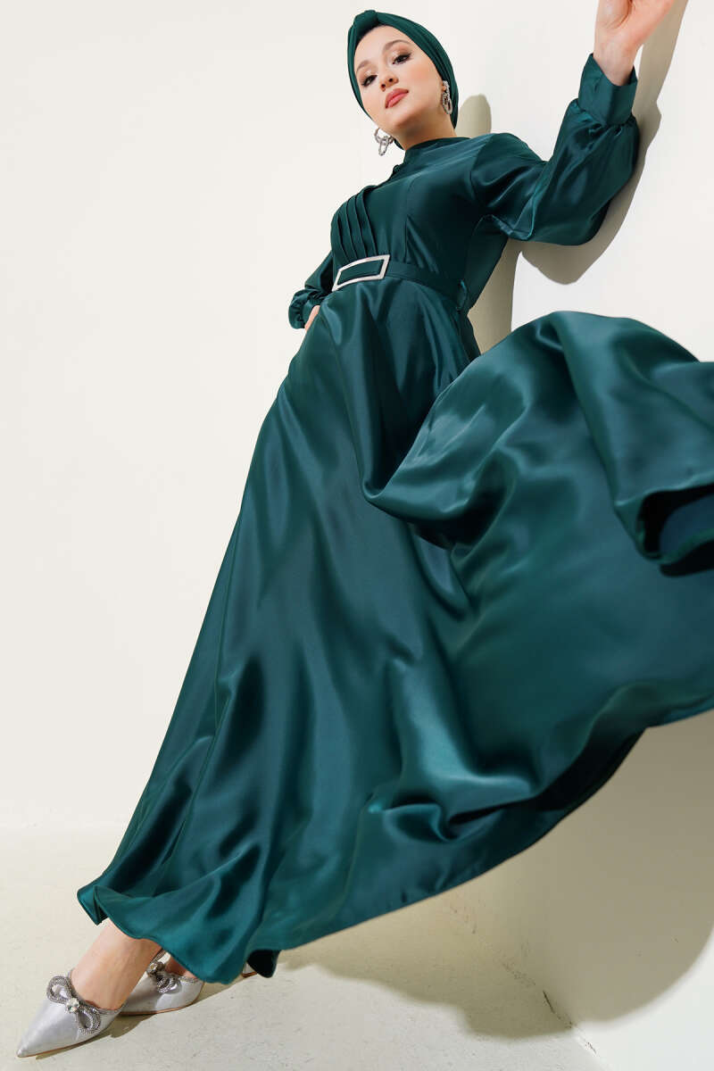 Önü Çapraz Piliseli Saten Elbise Zümrüt