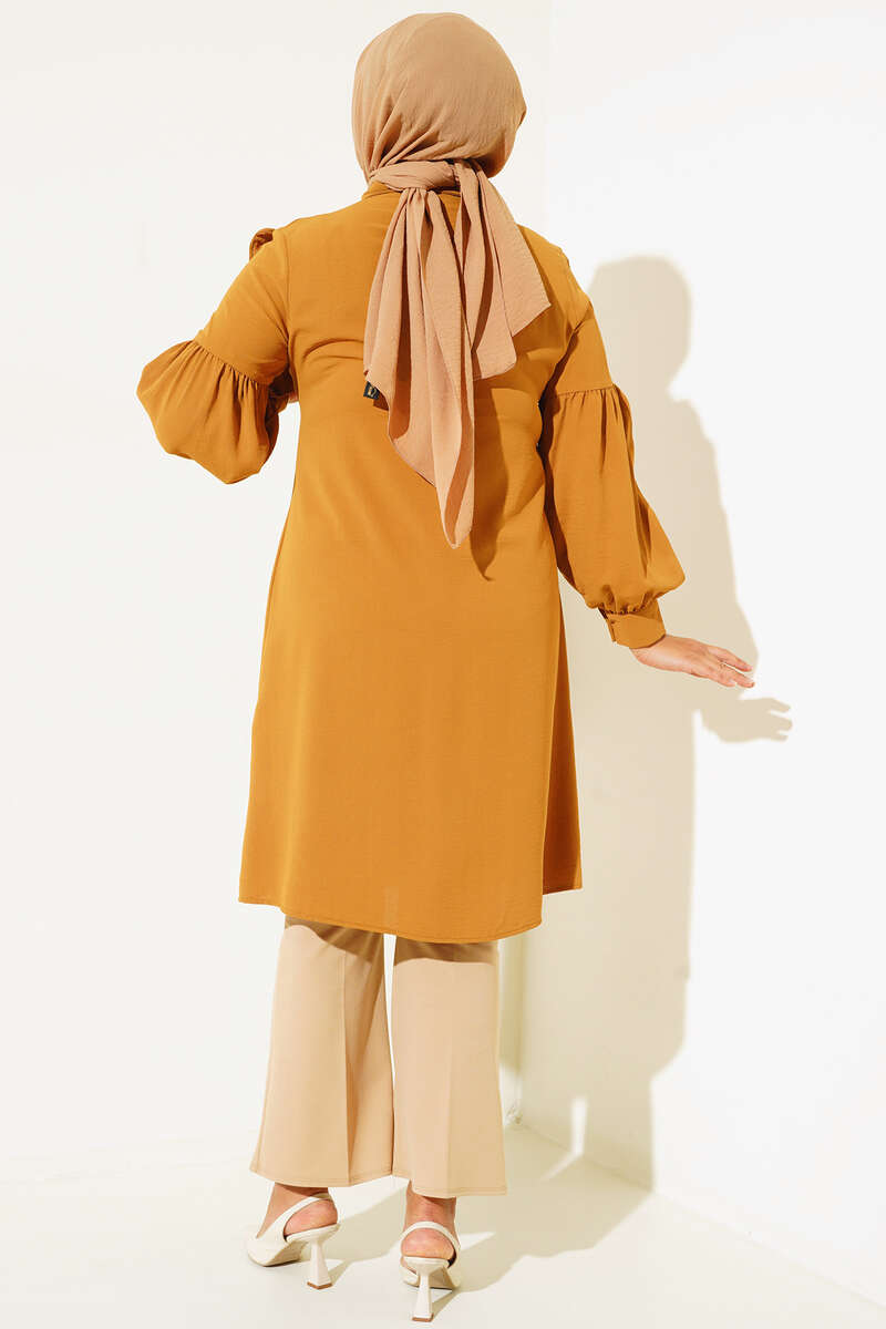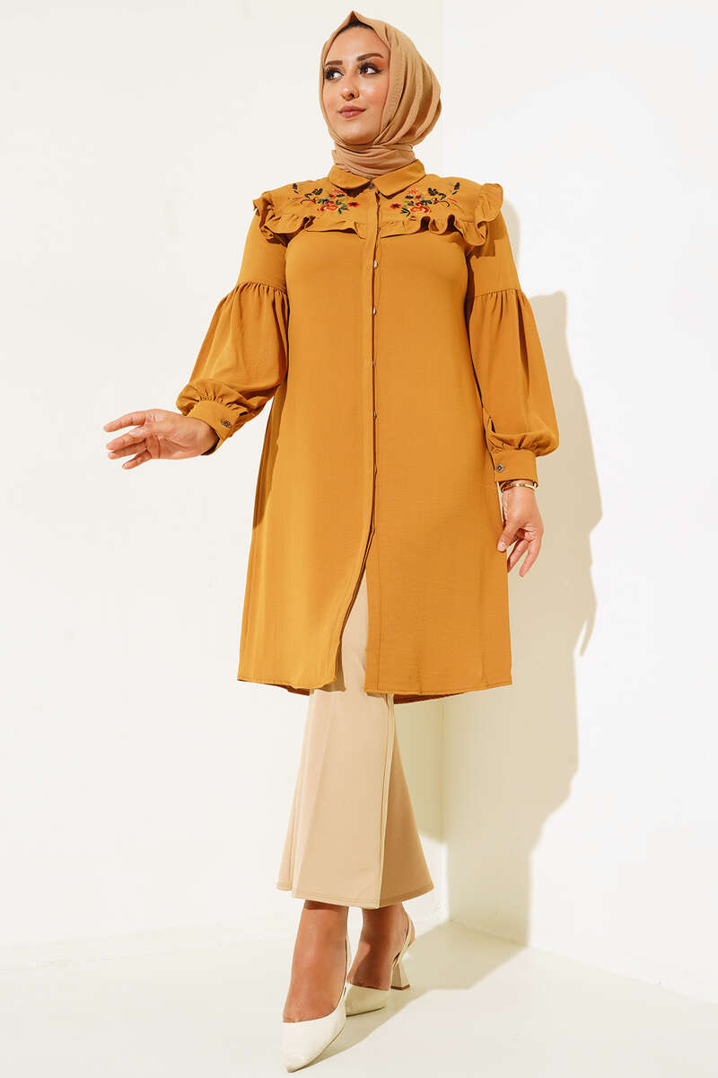 Önü Çiçek Nakış Fırfırlı Tunik Hardal