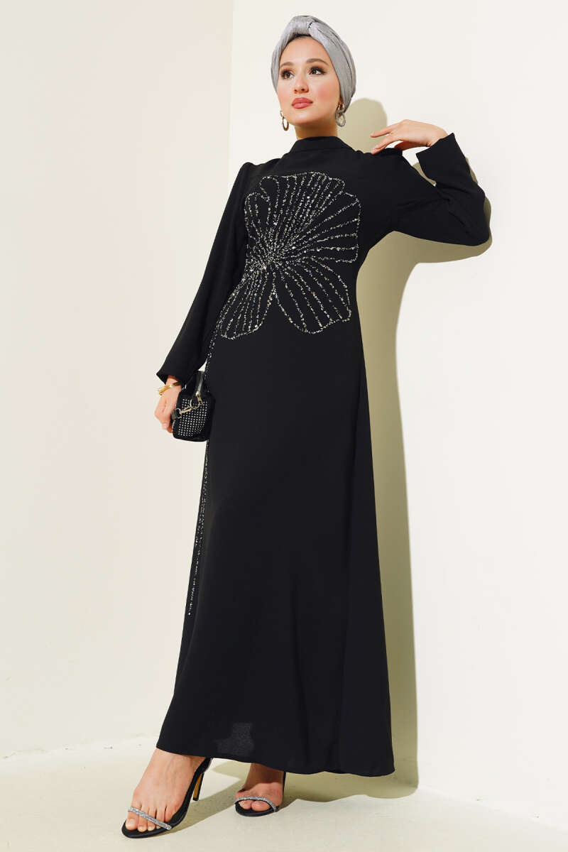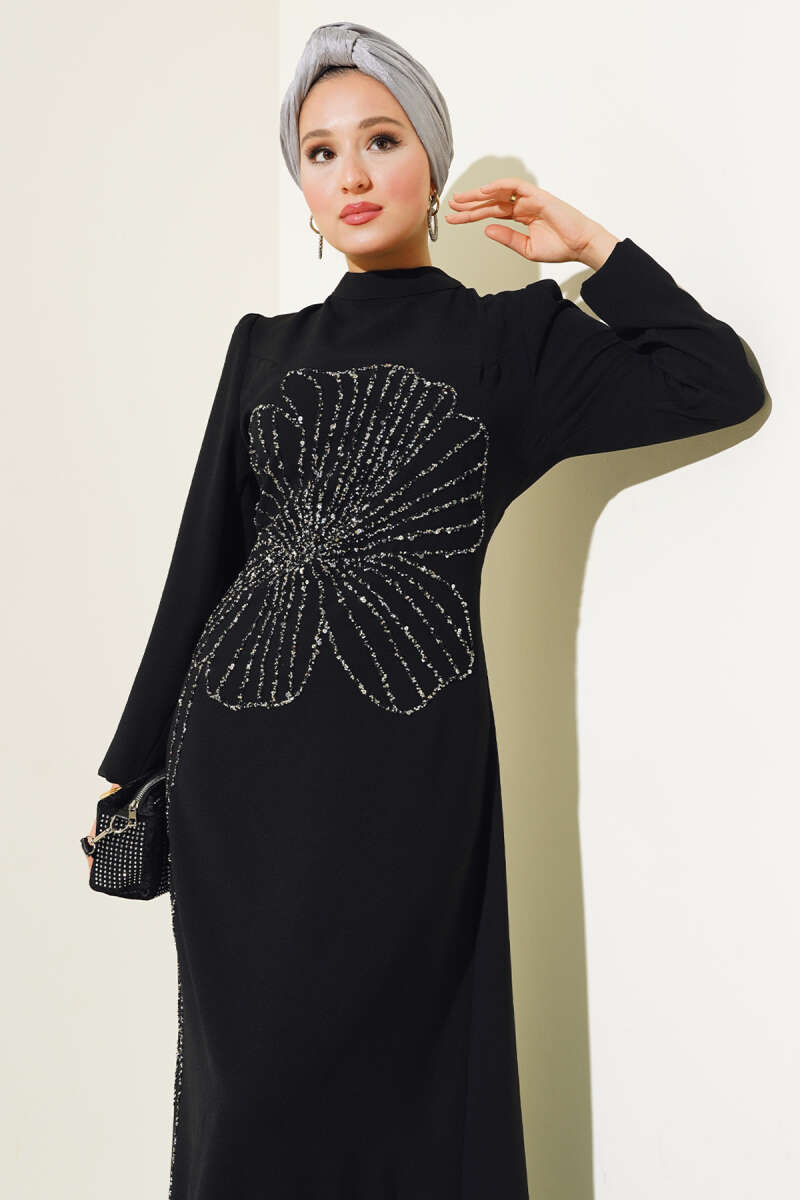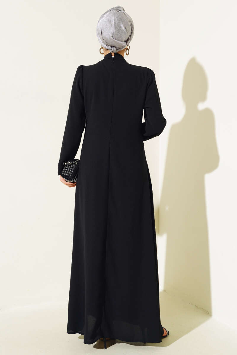 Metal Düğme Süslemeli Bağcıklı Elbise Siyah