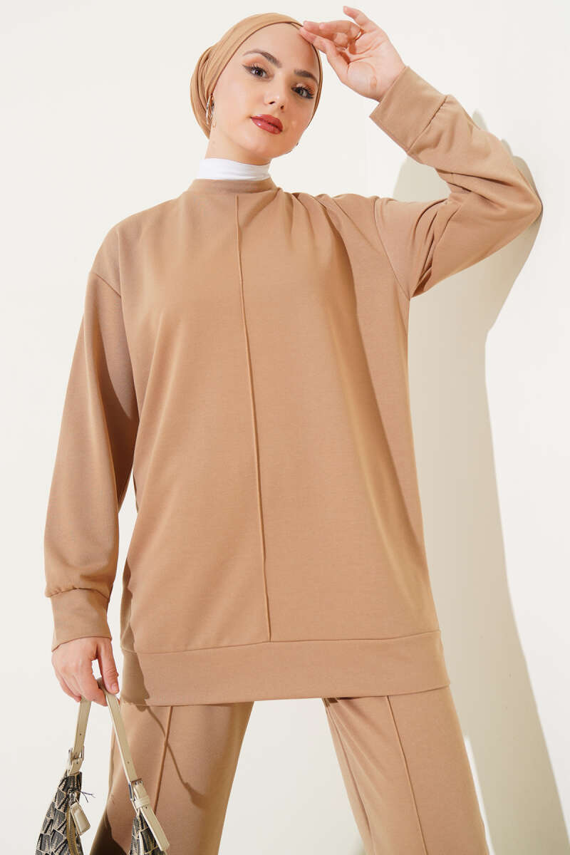 Asimetrik Kesim Bisiklet Yaka İkili Takım Kahve