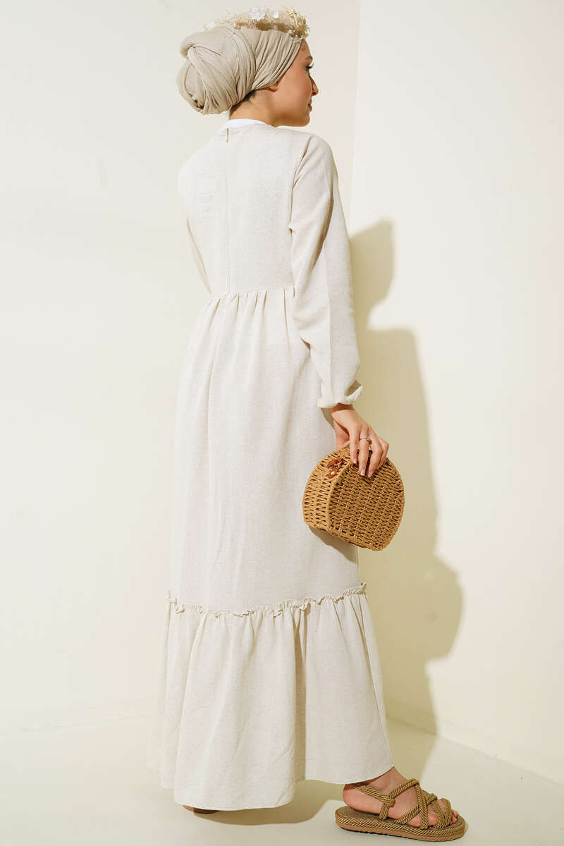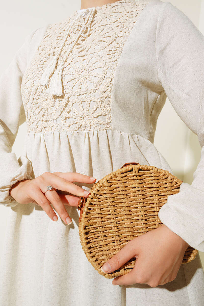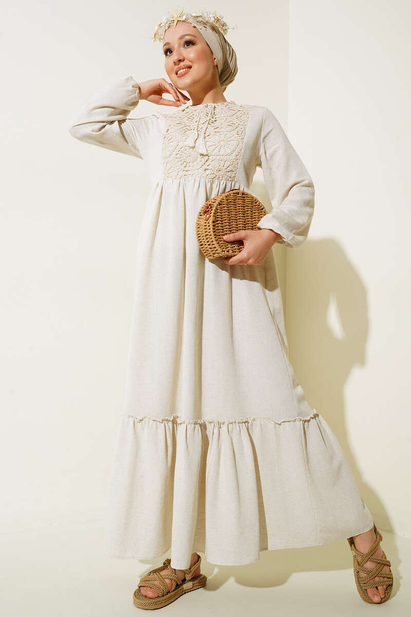 Yeni sezon elbisemiz sade ve şıklığıyla harika bir görünüm sunmaktadır. Elbisemiz önündeki dantel örgüyle dikkat çekmektedir. Bilekleri lastiklidir. Yakası ip bağlamalıdır. Sırtında fermuar bulunmaktadır. Her ortamda rahatlıkla giyebilirsiniz.