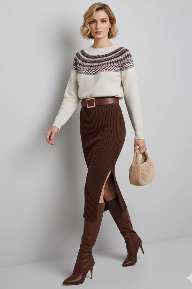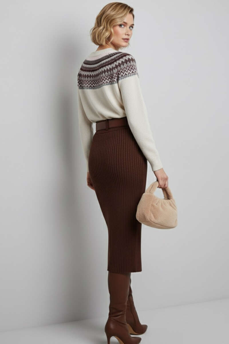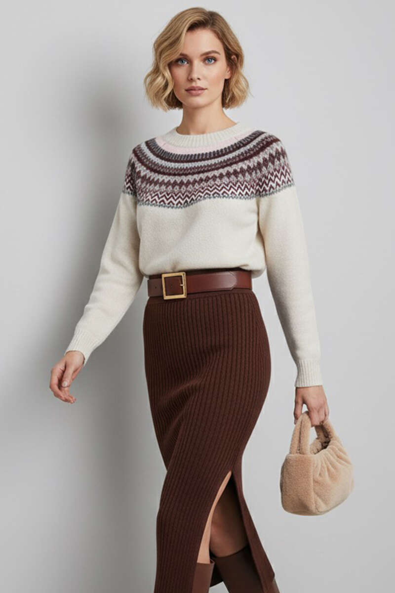 Önü Desenli Triko Kazak Bej