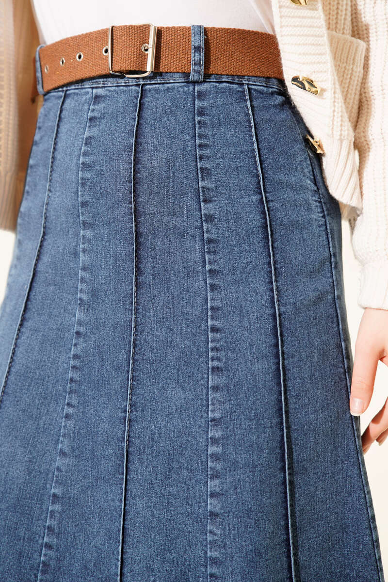 Önü Dikiş Detaylı Kemerli Kot Etek Kot