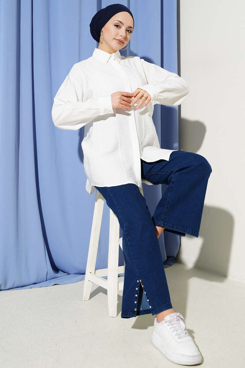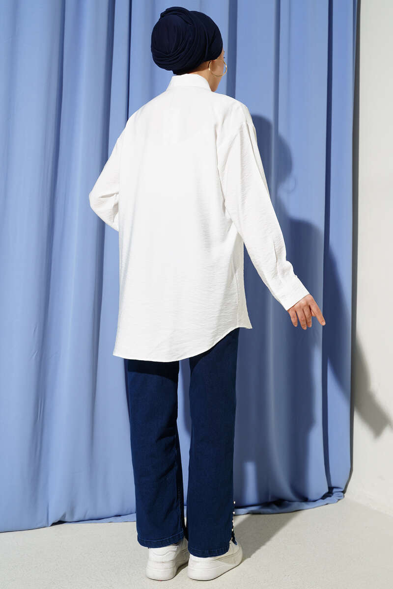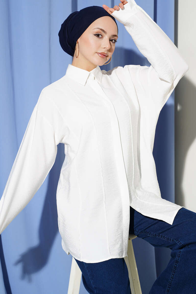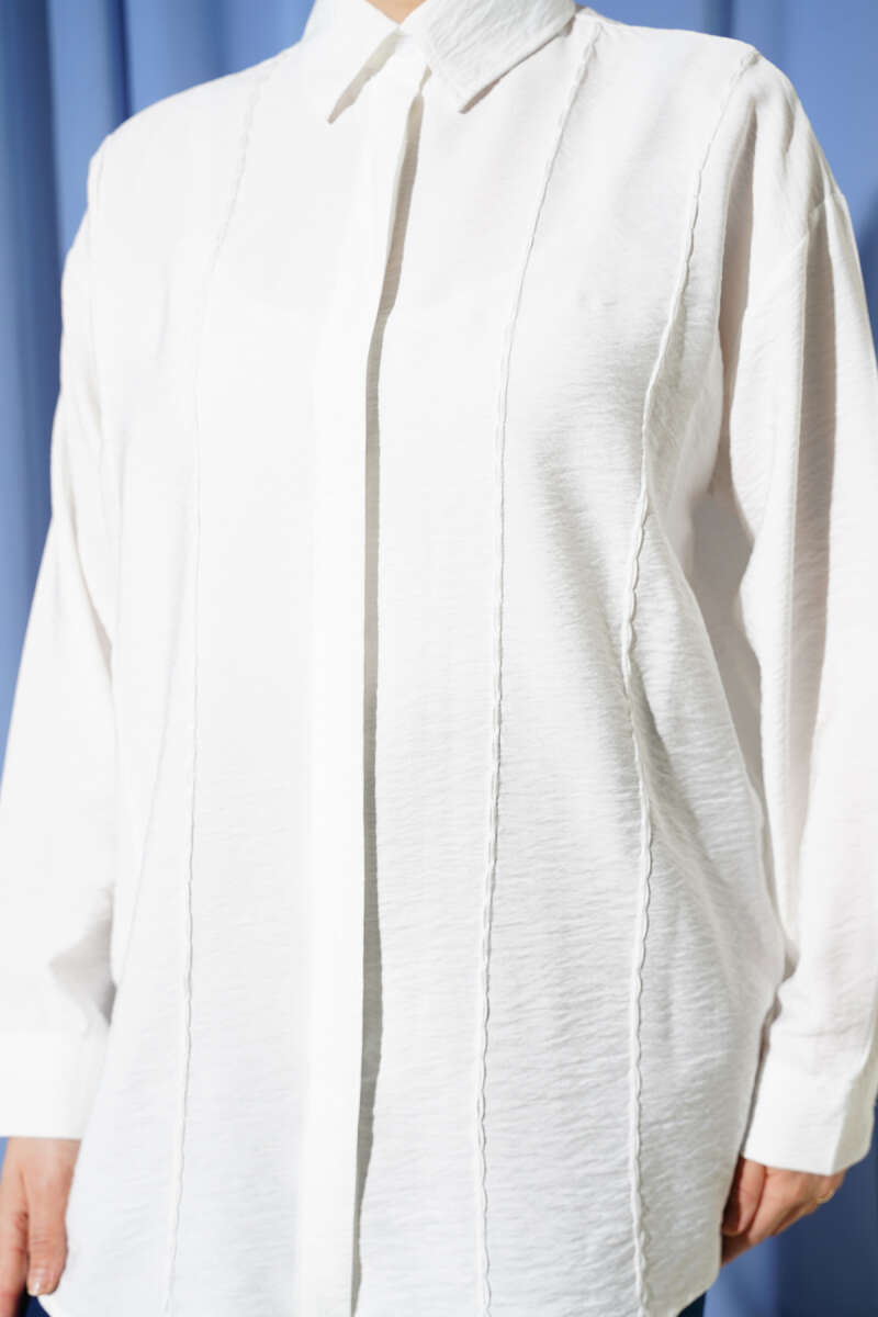 Önü Dikiş Detaylı Salaş Gömlek Ekru