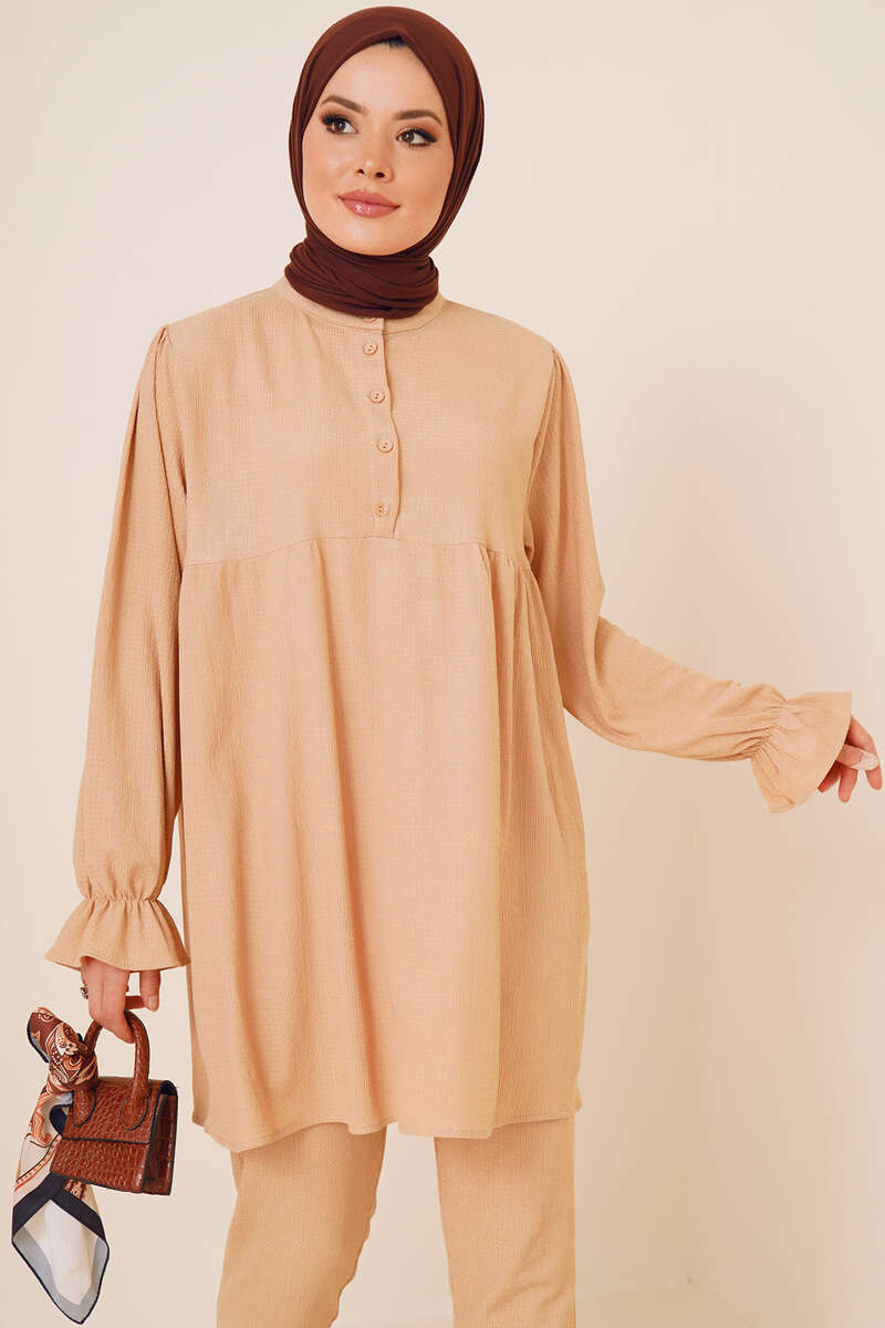 Önü Düğmeli Bürümcük İkili Takım Bej