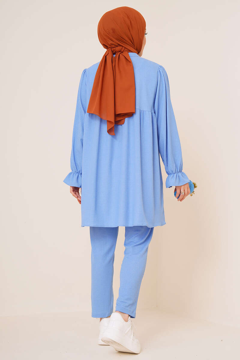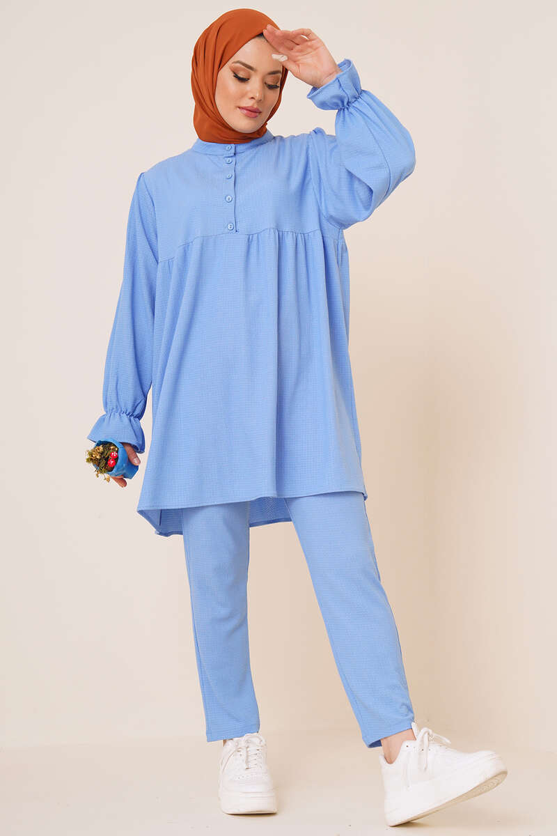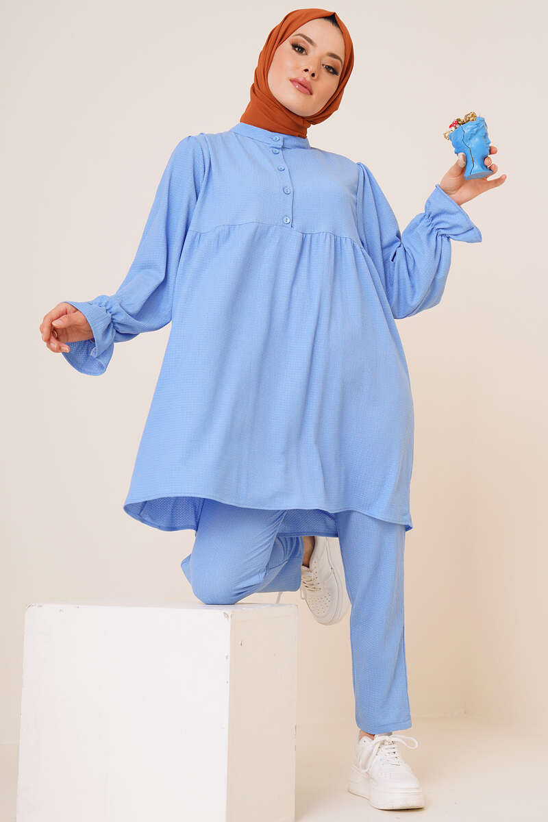 Yeni sezon ikili takımımız sade bir tasarıma sahiptir.. Takımımız bürümcük kumaştan yapılmıştır. Tuniğimizin önü düğmelidir. Hakim yakadır. Bilekleri lastiklidir. Uzun yapıdadır. Pantolon cepsiz beli lastiklidir. Oldukça rahattır. Takımımızı her ortamda rahatlıkla giyebilirsiniz. Farklı renk seçenekleri mevcuttur.