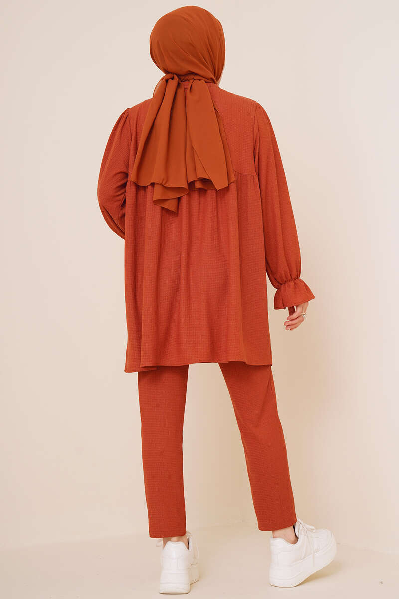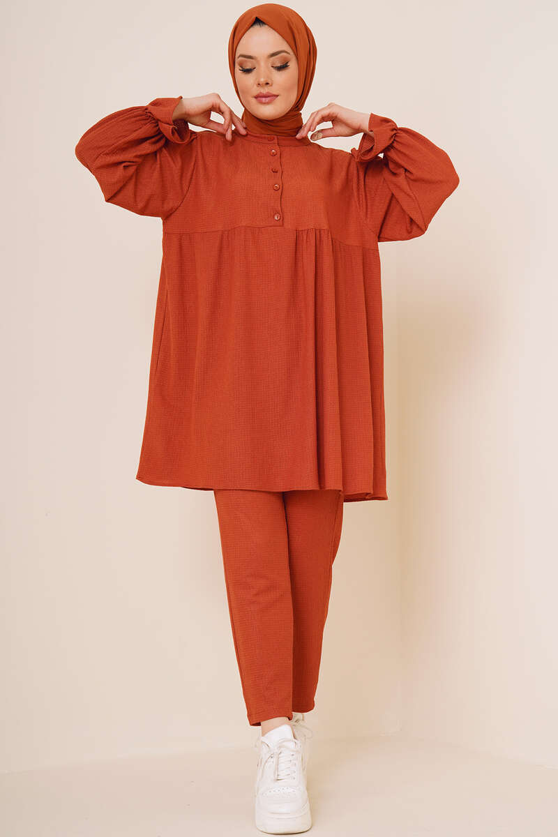 Yeni sezon ikili takımımız sade bir tasarıma sahiptir.. Takımımız bürümcük kumaştan yapılmıştır. Tuniğimizin önü düğmelidir. Hakim yakadır. Bilekleri lastiklidir. Uzun yapıdadır. Pantolon cepsiz beli lastiklidir. Oldukça rahattır. Takımımızı her ortamda rahatlıkla giyebilirsiniz. Farklı renk seçenekleri mevcuttur.